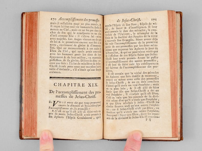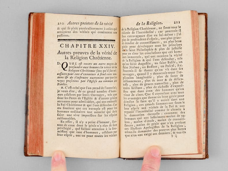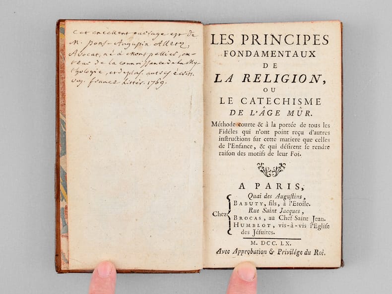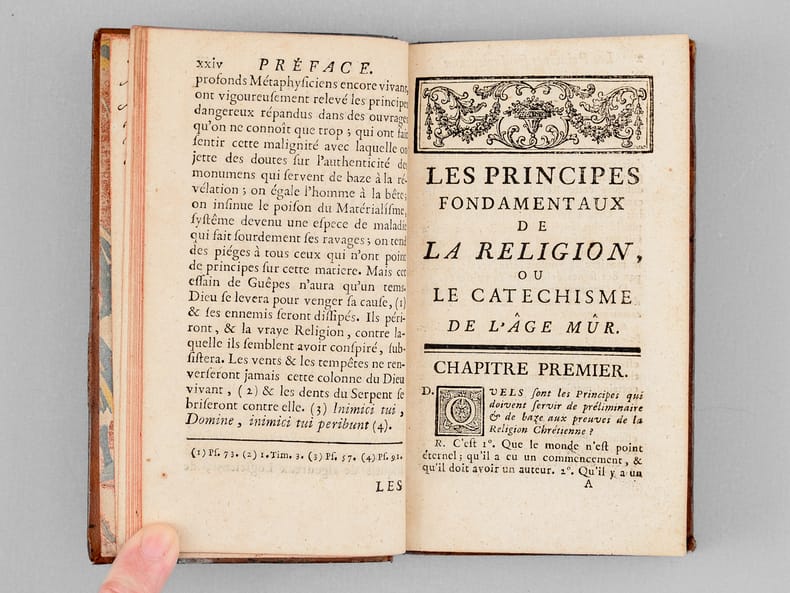 1 vol. in-12 reliure de l'époque pleine basane mouchetée, Chez Babuty fils, Brocas, Humblot, Paris, 1760, XXIV-264 pp. Rappel du titre complet : Les Principes Fondamentaux de la Religion, ou le Catéchisme de l'âge Mûr. Méthode courte & à la portée de tous les Fidèles... & qui désirent se rendre raison des motifs de leur Foi