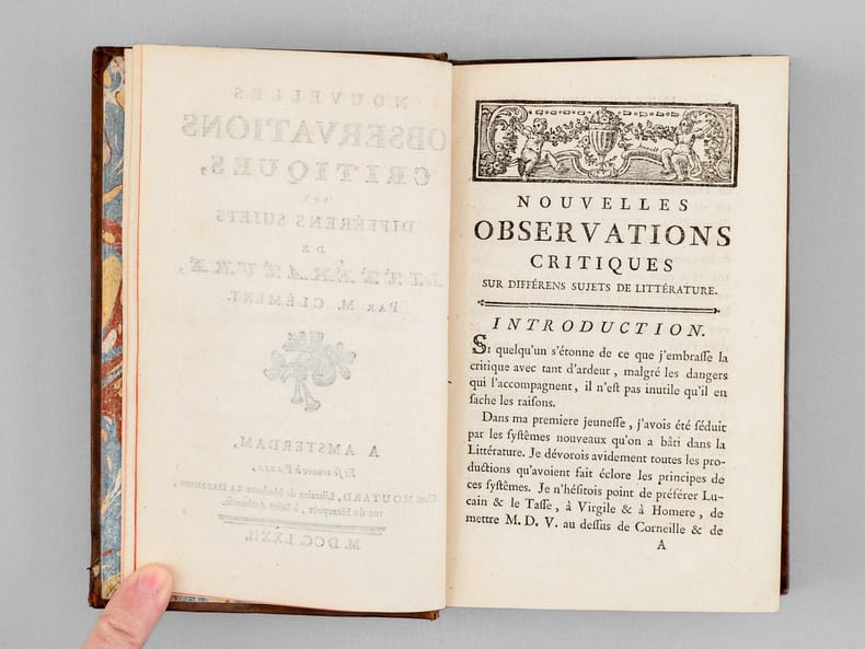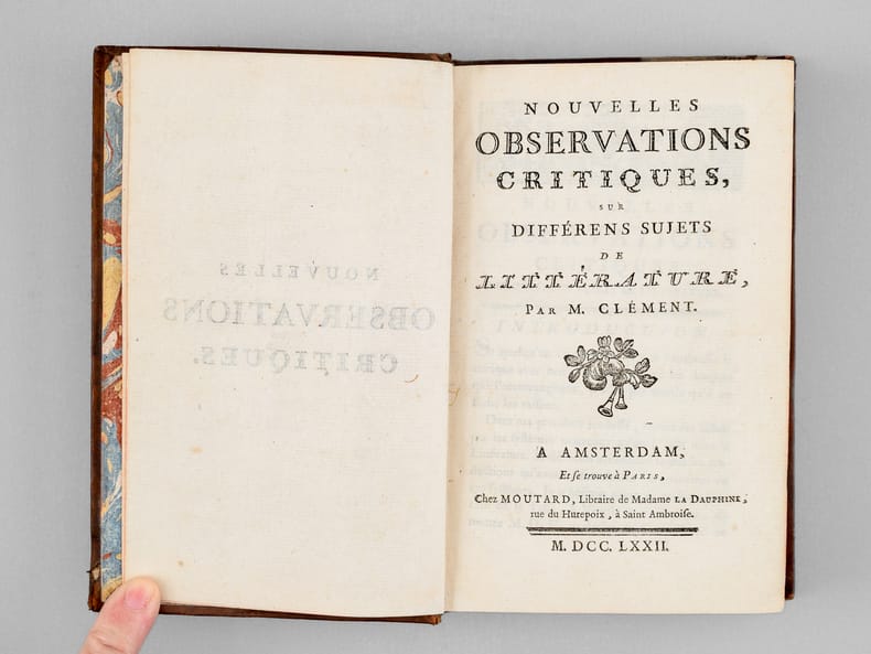Recueil de 3 essais consacrés aux "Nuits d'Young", à la manière de traduire la poésie et à la satire, par le célèbre Jean-Marie Clément (1742-1812) surnommé "l'Inclément" par Voltaire. La préface est remarquable, l'auteur y évoquant ses premières années et sa préférence pour les philosophes (M.D.V., Diderot, etc...) avant de s'apercevoir, par une étude approfondie des Anciens, "que nous étions prodigieusement déchus"... Bon état (reliure lég. frottée)