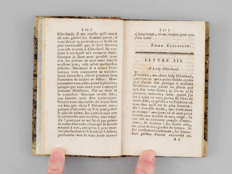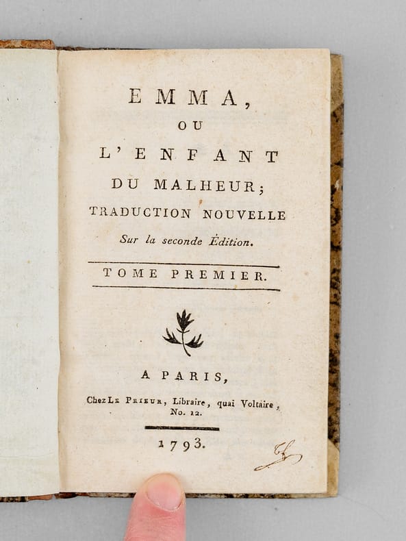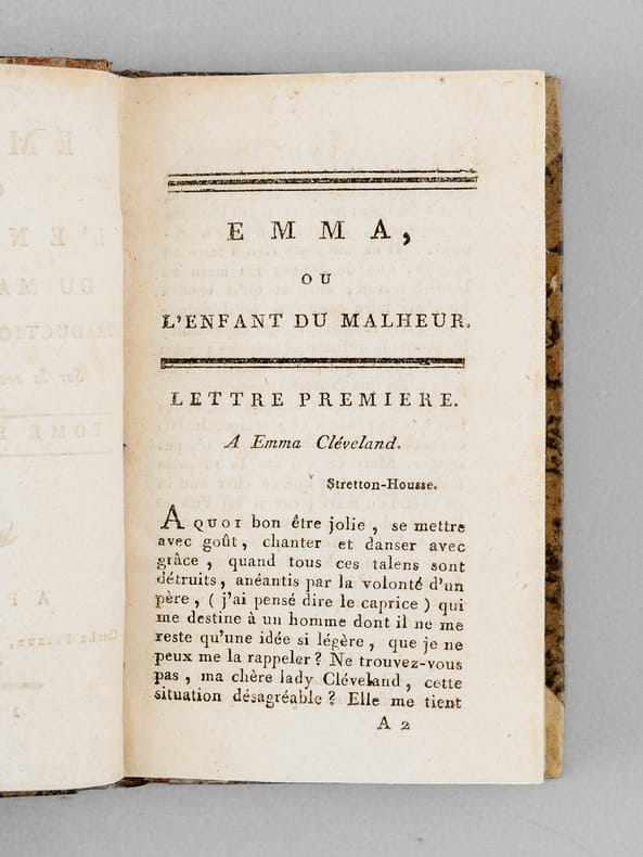 Traduction française de "Emma Or the Child of Sorrow: A Novel". Une autre traduction, parue en 1788, avait pour titre "Histoire de Lady Cleveland". Bon état (dos lég. frottés, qq. pliure à qq. feuillets).