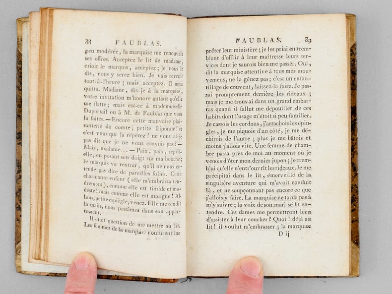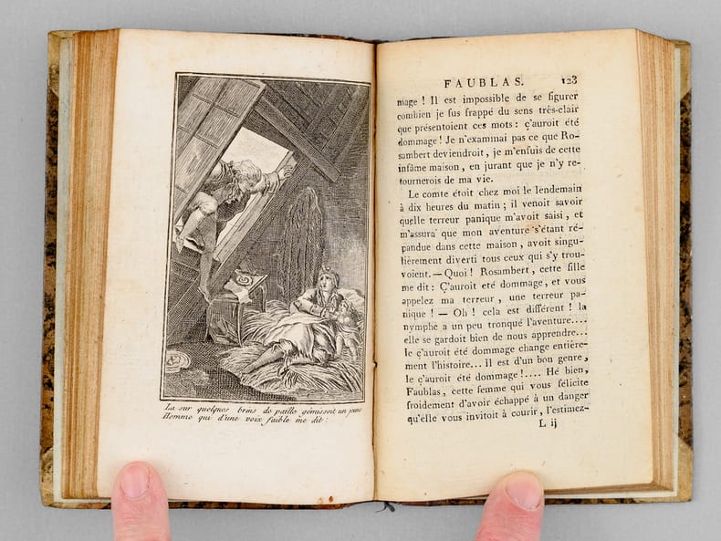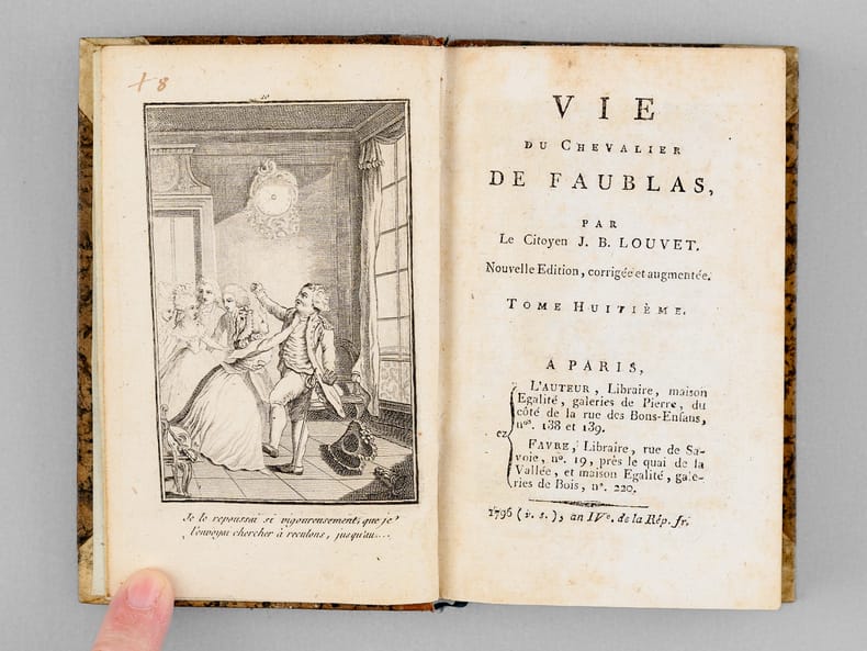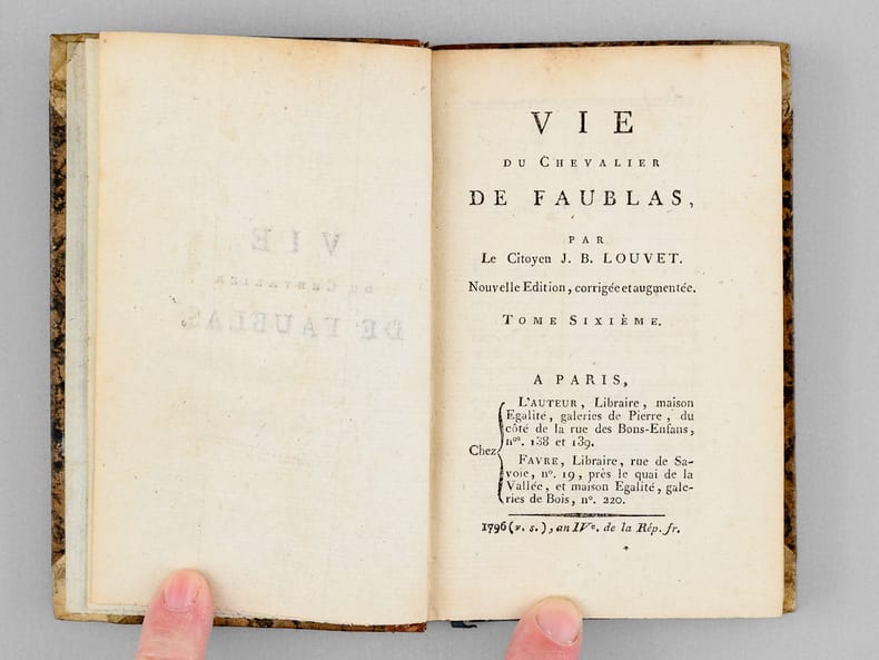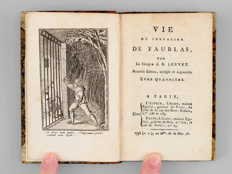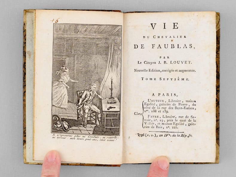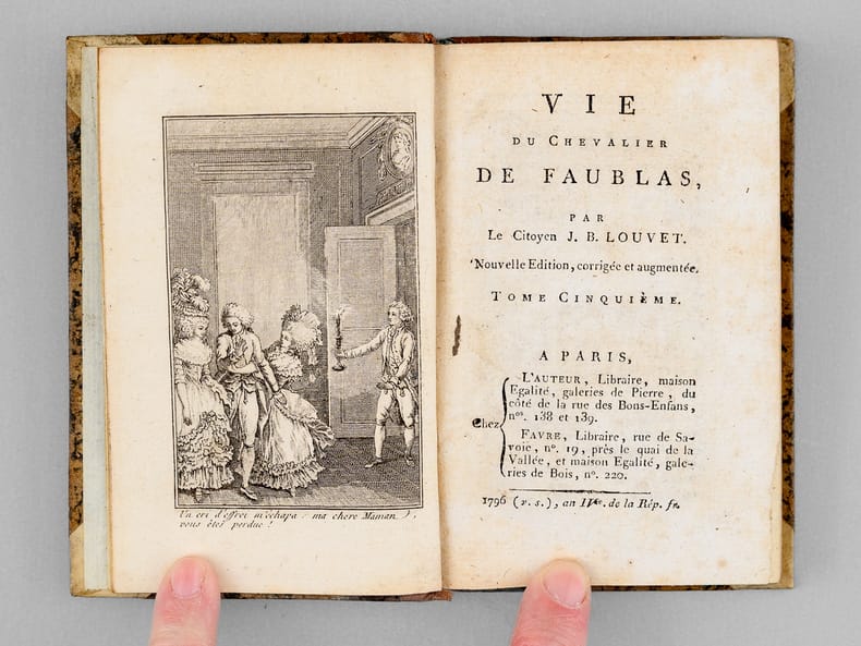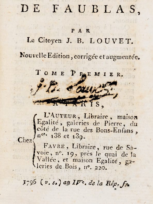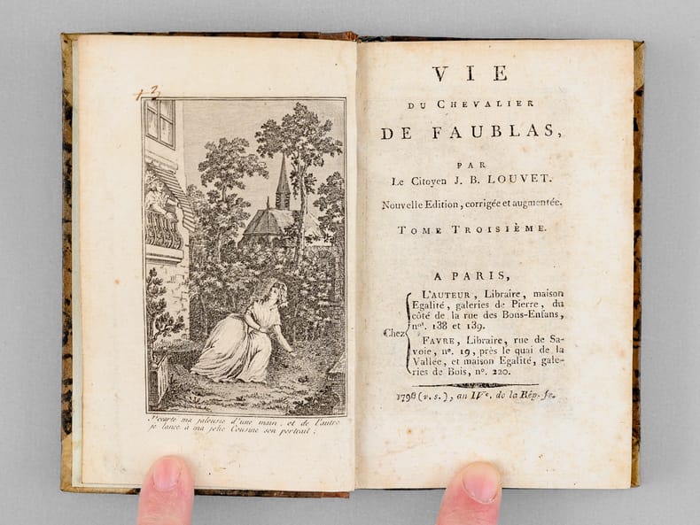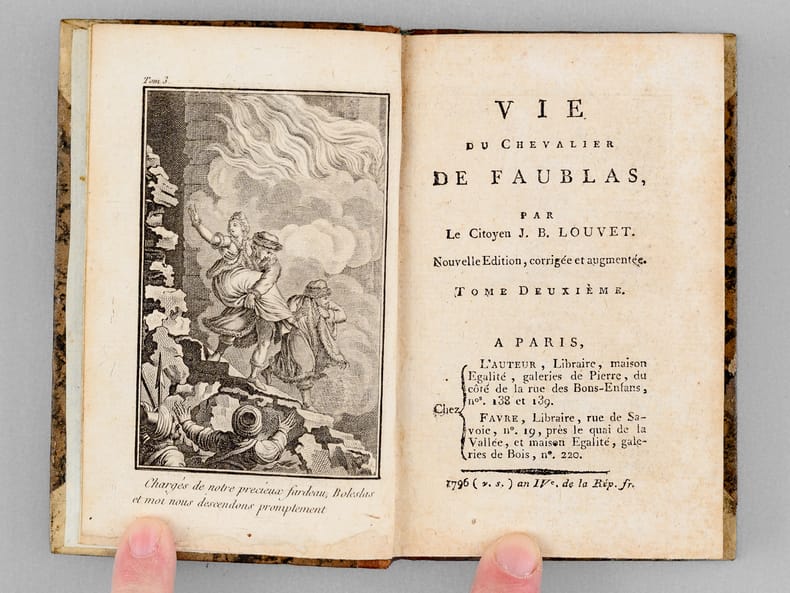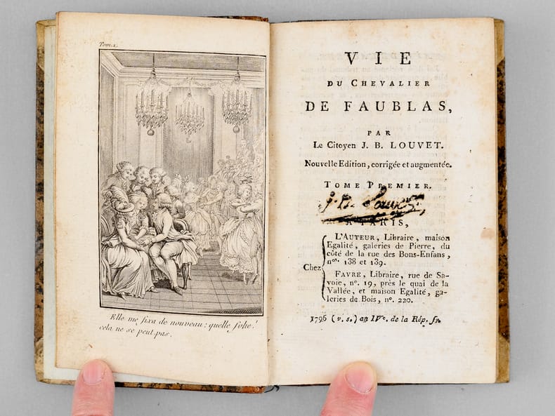 Remarquable exemplaire de cette édition corrigée et augmentée, signée par Jean-Baptiste Louvet de Couvray en page de titre du premier tome. On peut également lire au faux-titre un cachet indiquant : "Edition tolérée". Etat très satisfaisant (dos lég. frottés et secs avec petits mq. en coiffes, bon état par ailleurs)