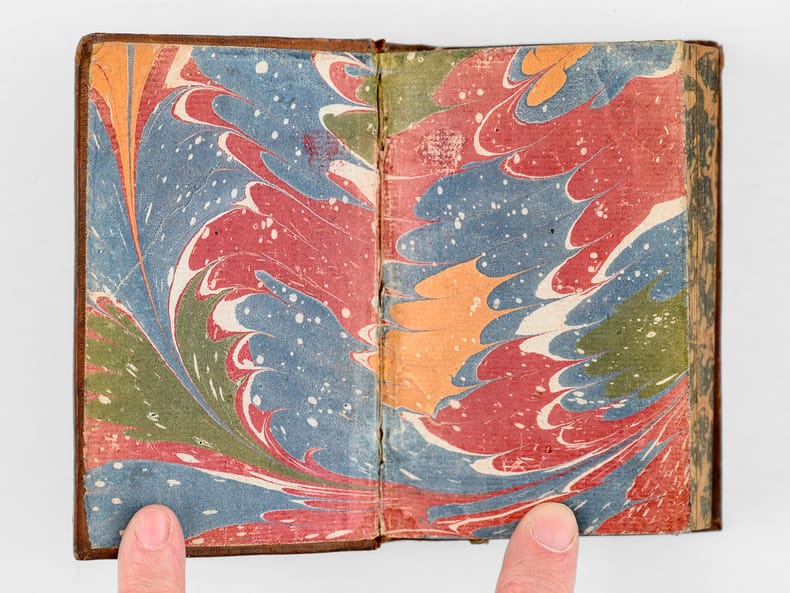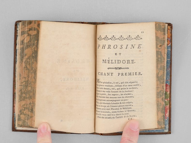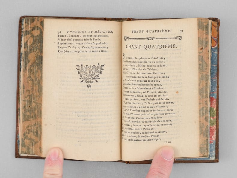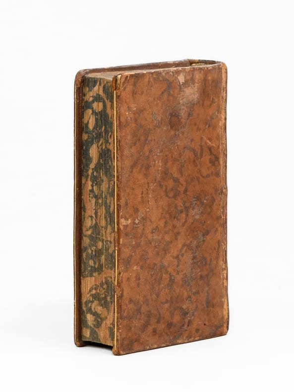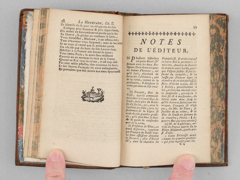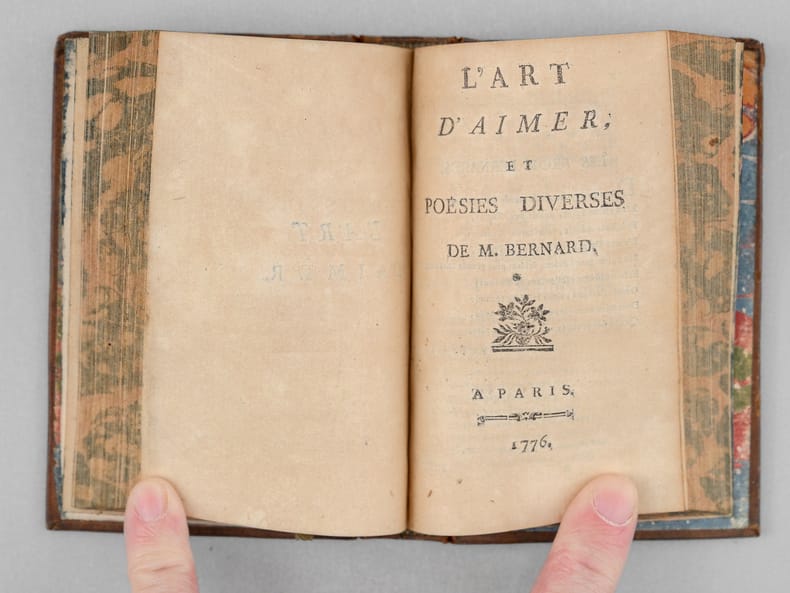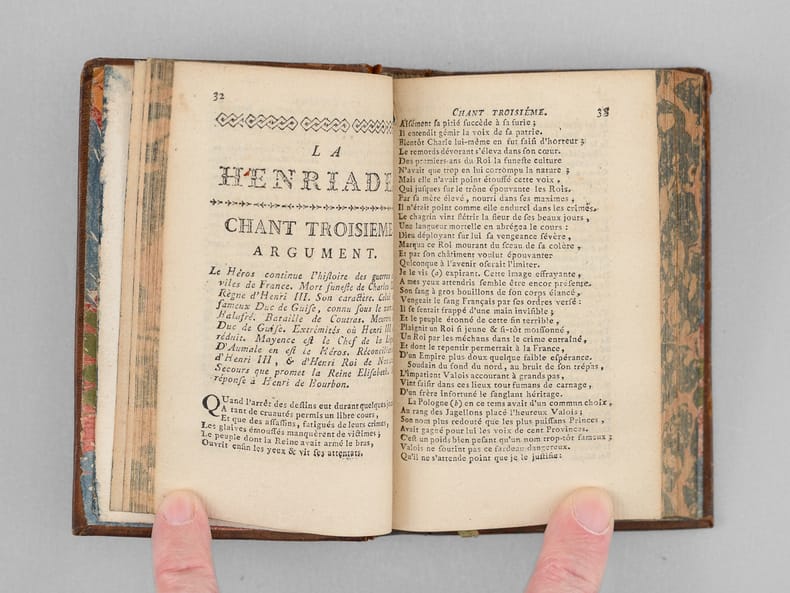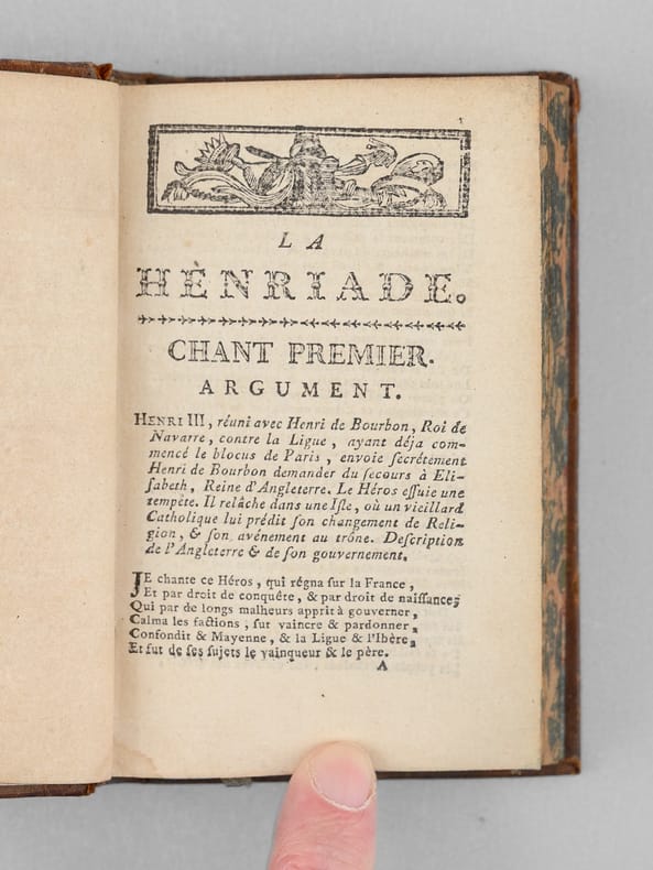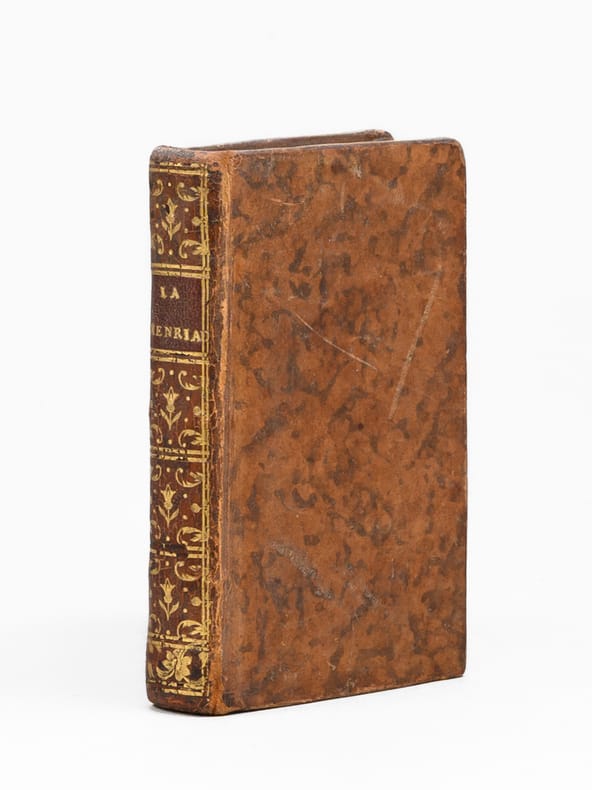 1 vol. in-18 reliure de l'époque plein veau marbré, dos lisse orné, toutes tranches marbrées, filets dorés en coupes, Paris, 1775 (Henriade), 1776 (Art d'aimer), Genève, 2 ff., 161-141 pp.