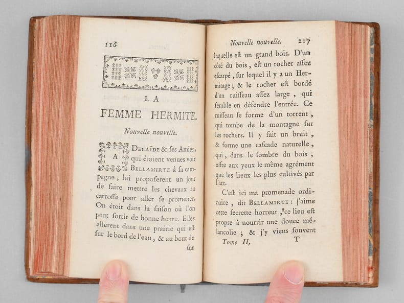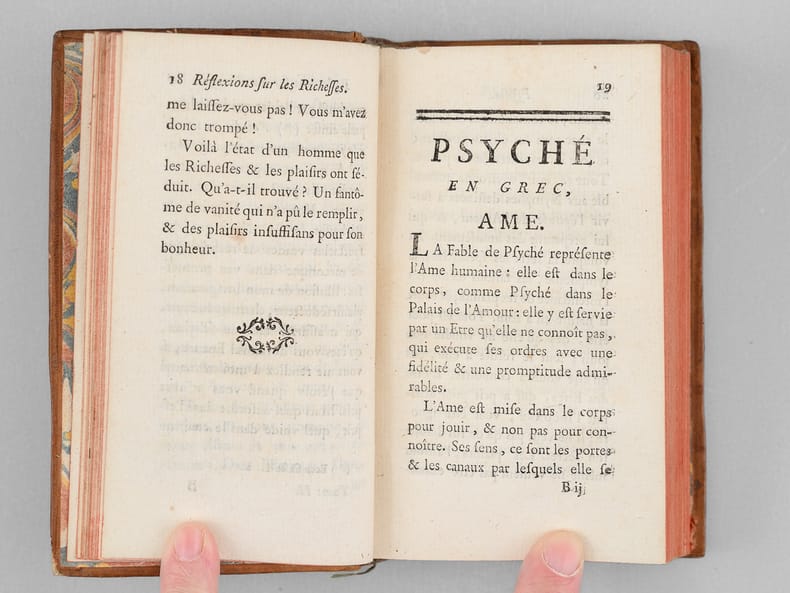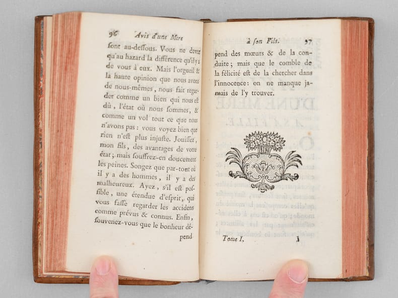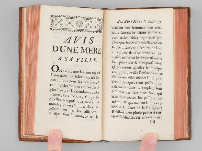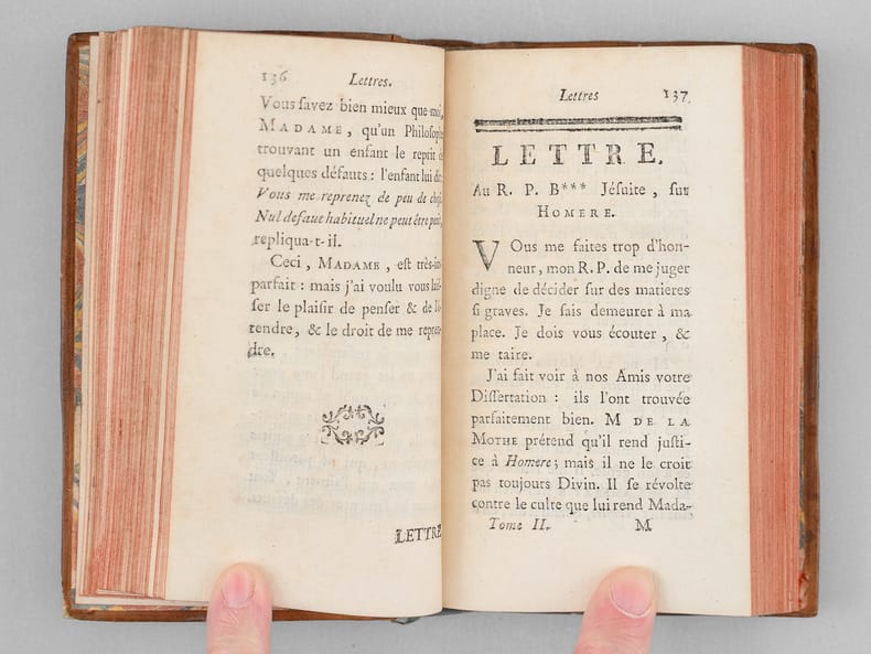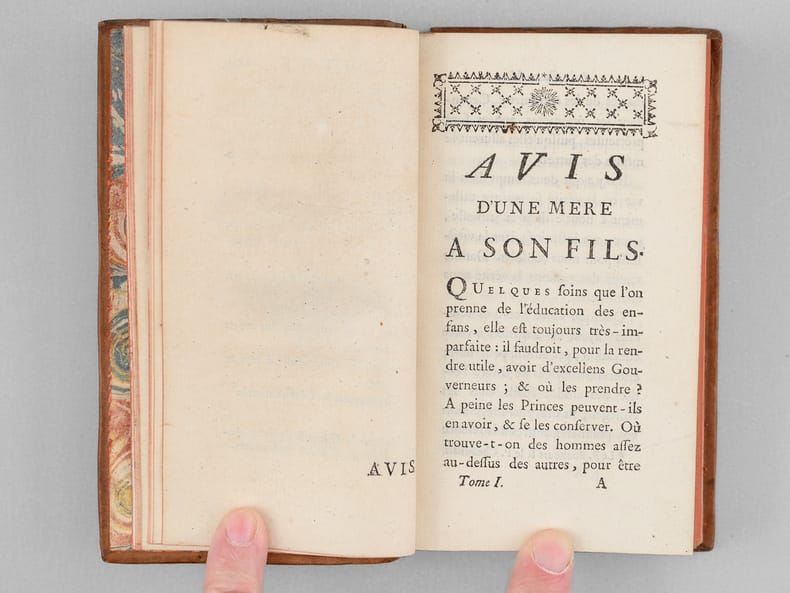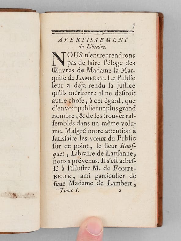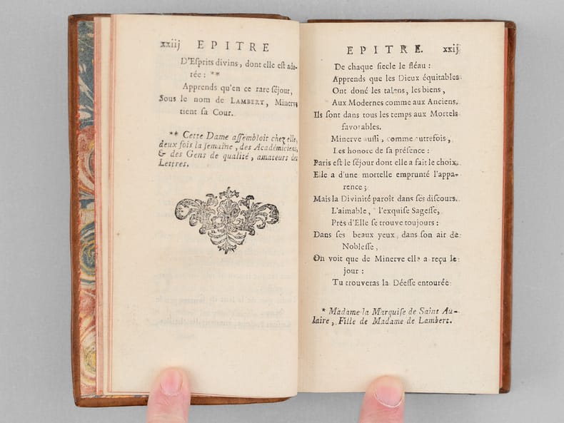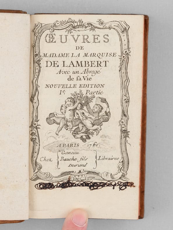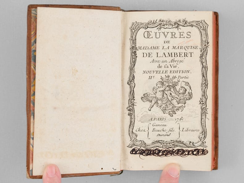 Le Salon que la Marquise de Lambert (1647-1733) tenait sous la Régence se distinguait par sa bienséance et son bon goût. On a pu y voir "le berceau de l'Encyclopédie". Etat très satisfaisant (petites usures en coiffes, petits mq. en coupes, bon état par ailleurs).