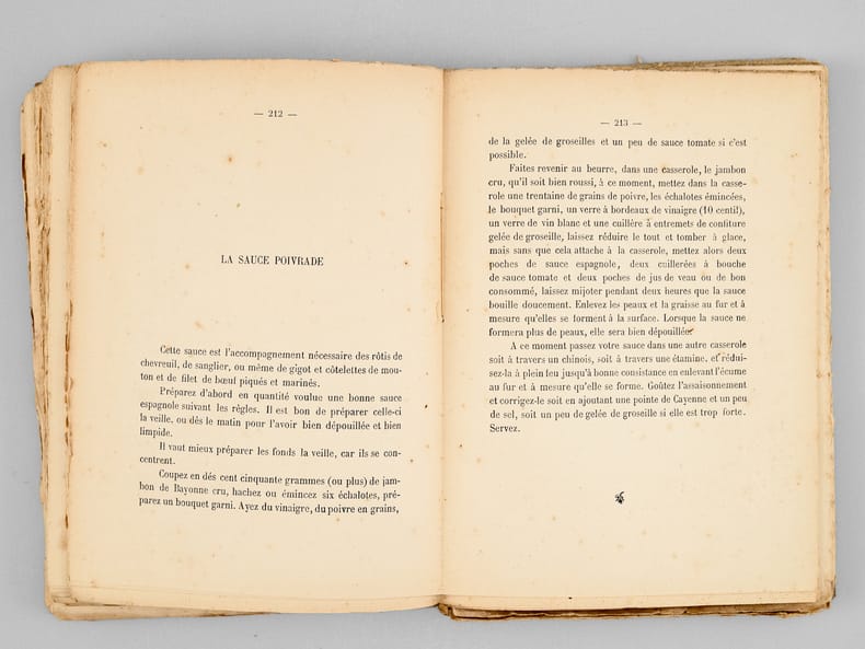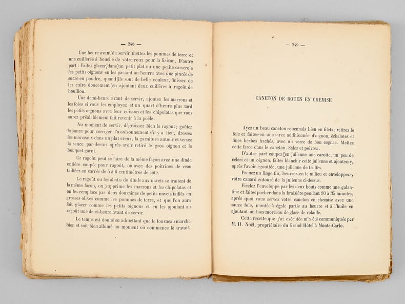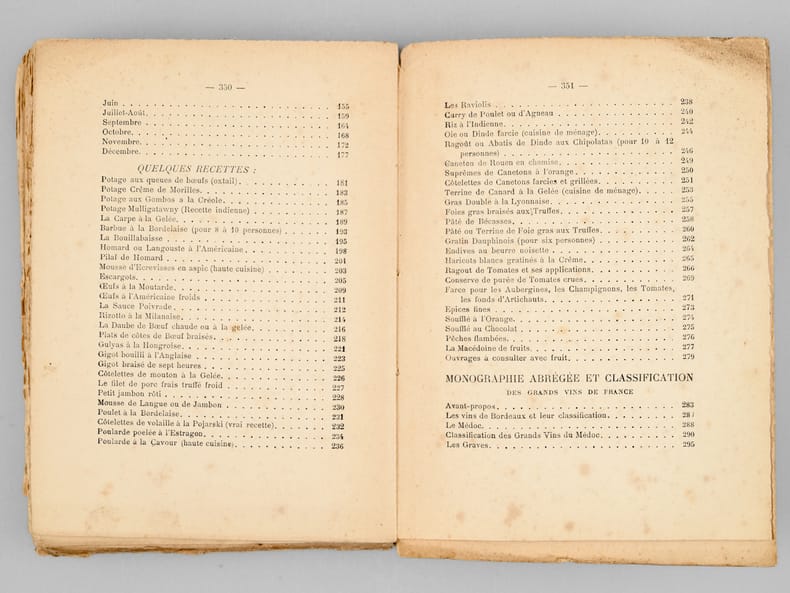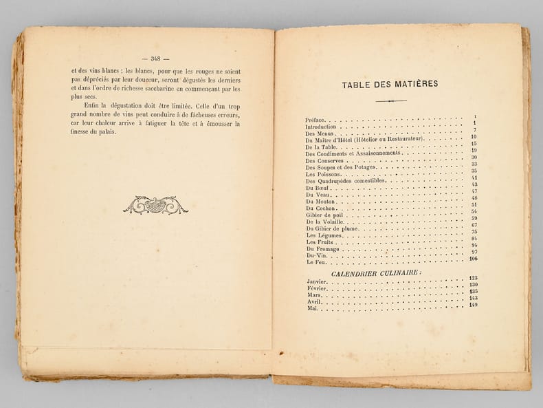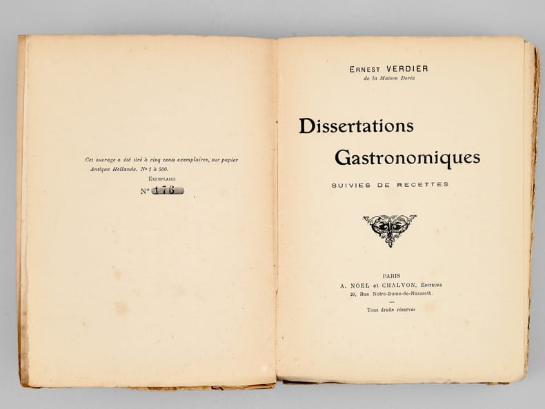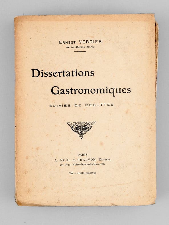 Fondé par Louis Verdier en 1841, le restaurant "La Maison dorée" fut d'abord appelé "Restaurant de la Cité" par son fondateur, mais vite renommé par ses clients en raison du luxe de sa décoration. Les cabinets réservés aux hôtes de marque accueillirent les personnalités les plus célèbres. C'est dans la "Maison dorée" que le chef Casimir Moisson aurait créé le tournedos Rossini. Ernest Verdier écrit dans sa préface : "Nous ne prétendons pas, ici, présenter un livre de cuisine [ ... ] mais simplement exposer les règles que dicte l'usage, donner des renseignements généraux que l'on en trouve que très rarement dans les livres voulant enseigner l'art culinaire [ ... ] et formuler quelques recettes complètes, car bien peu de grands chefs ont consenti à livrer les secrets de leur art". Bon état (qq. rouss.).