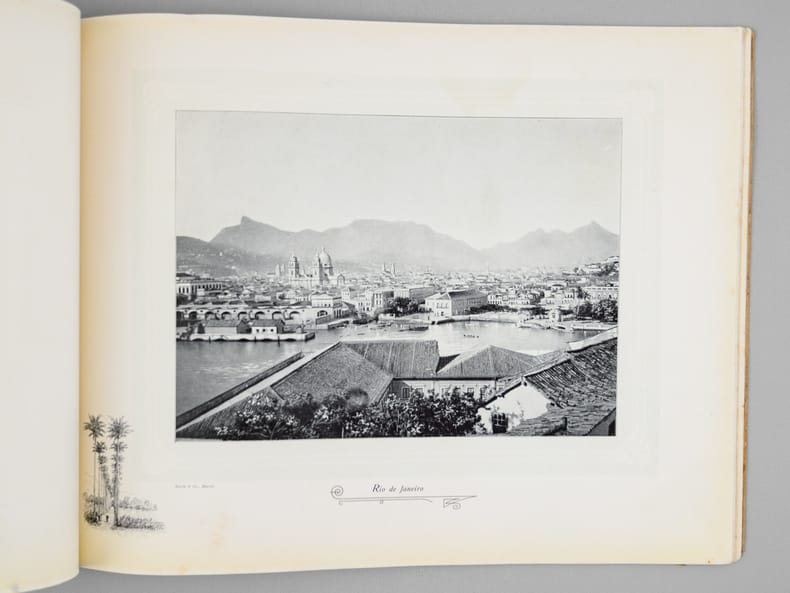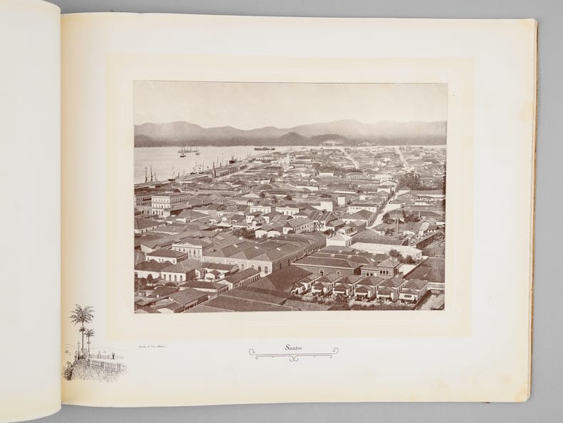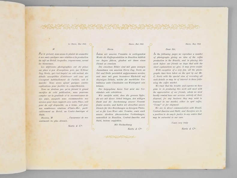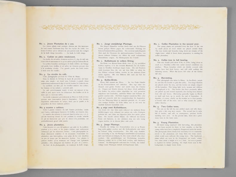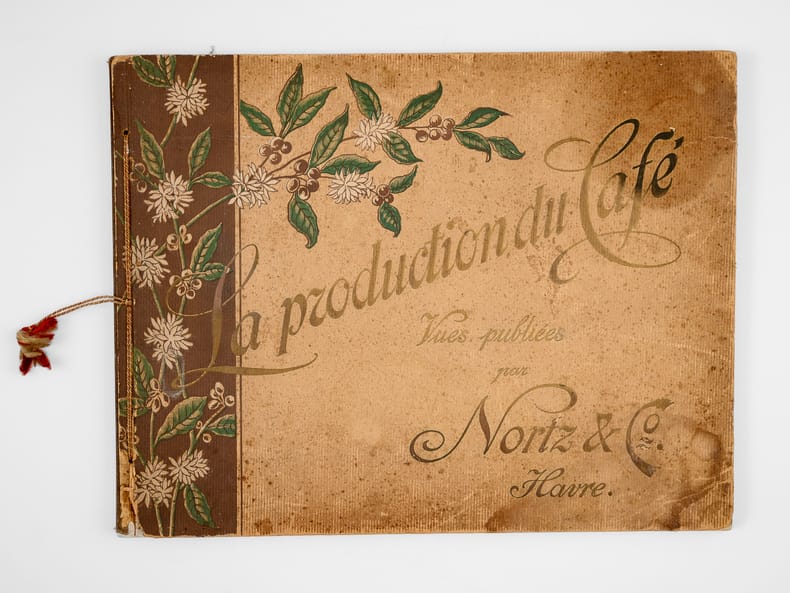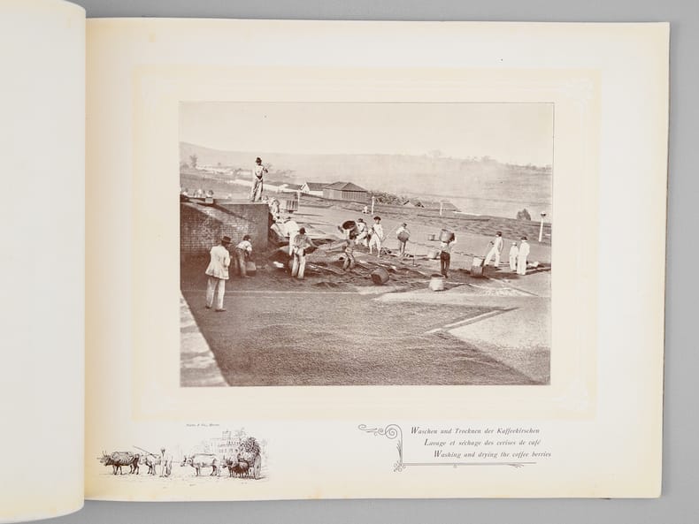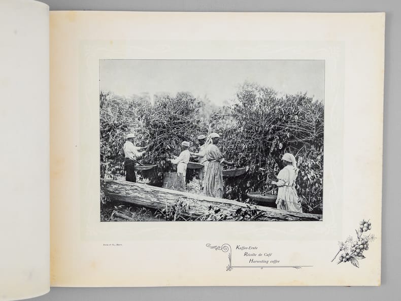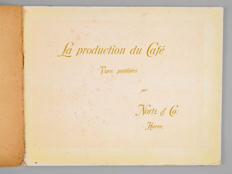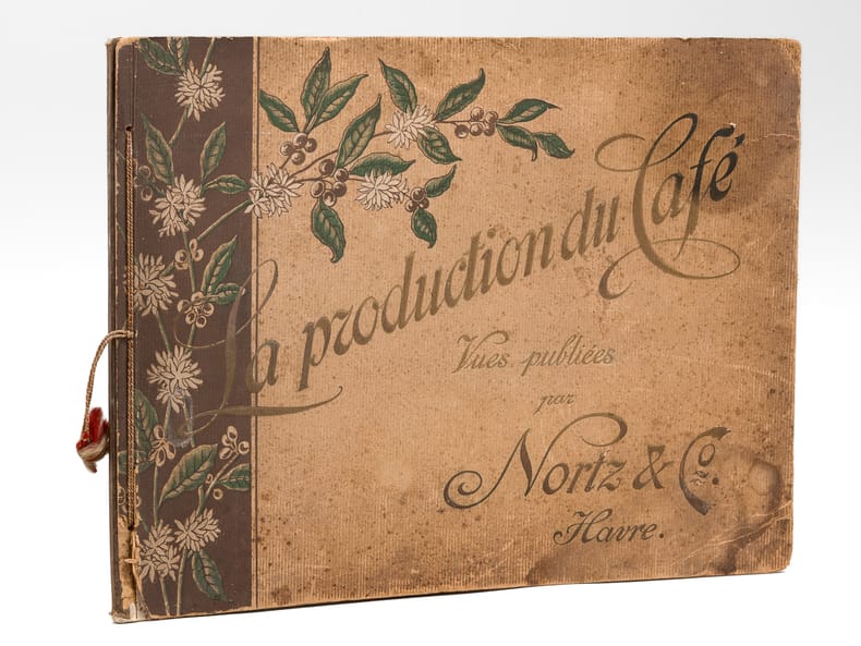 Rare et bel album commentées en 3 langues (français, anglais, allemand), relatives à la production de café au Brésil. La plupart des vues sont prises au Brésil, les dernières en Haïti, à la Jamaïque, puis au Havre. Etat très satisfaisant (accrocs et qq. frott. en couv., bon état intérieur). A rare and beautiful album on coffee production in Brazil, with commentary in three languages (French, English, German), relating to coffee production in Brazil. Most of the photos were taken in Brazil, the last ones in Haiti, Jamaica, and then Le Havre.
