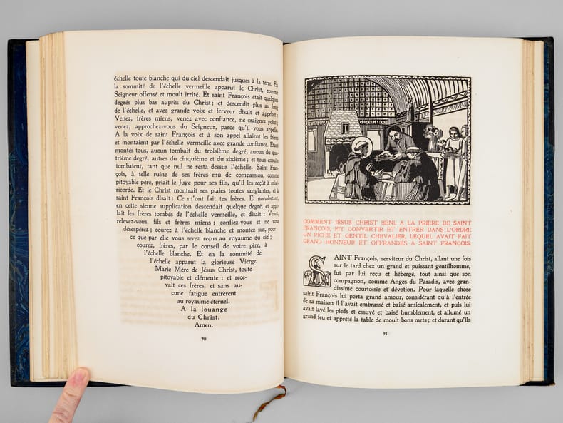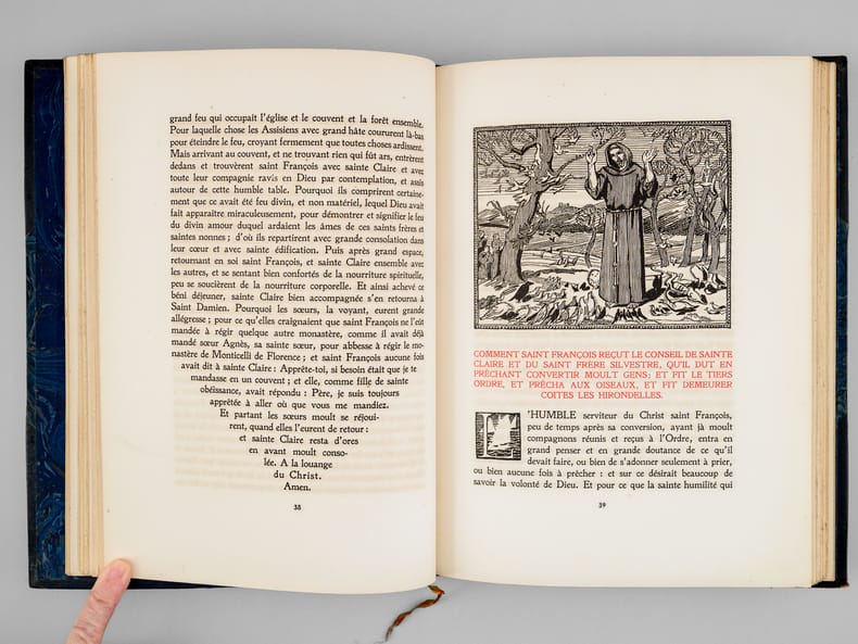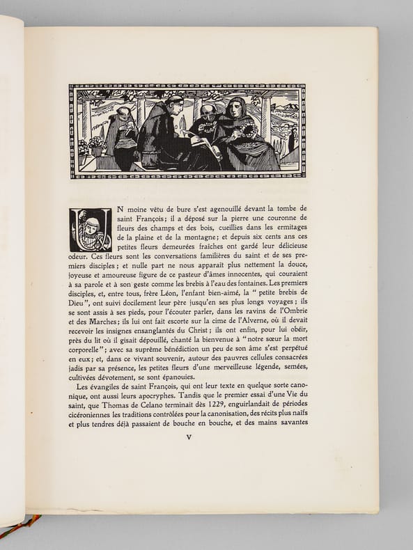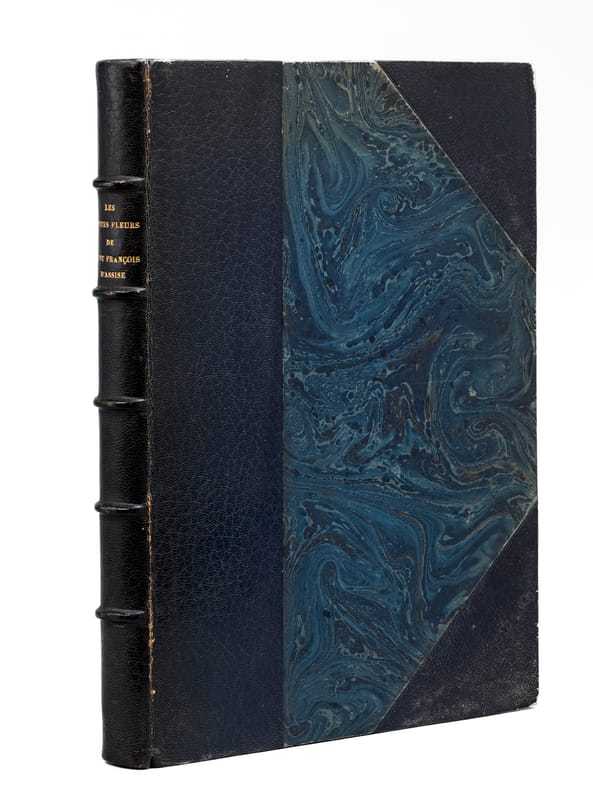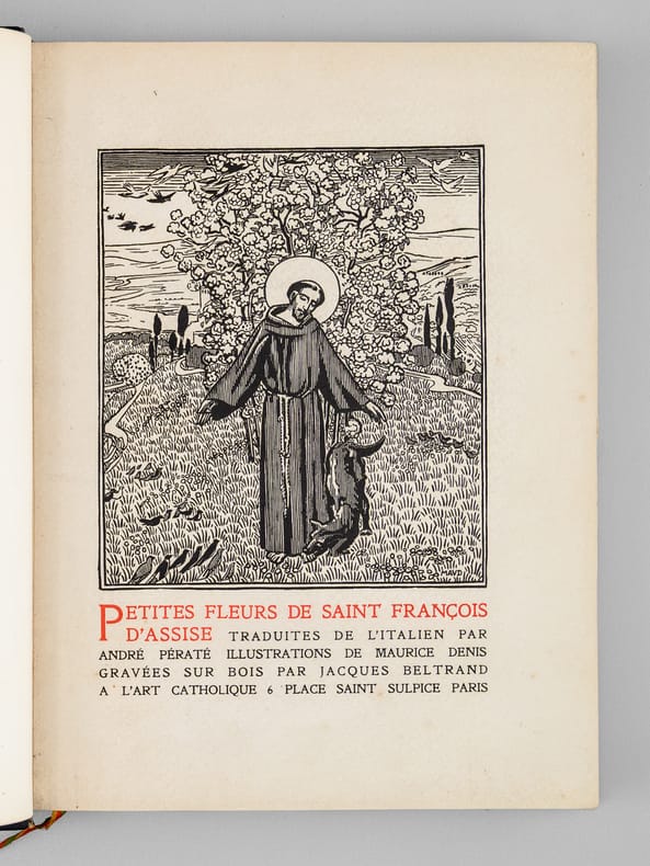 Petites fleurs de Saint François d’Assise. Traduites de de l’italien par André PERATE. Illustrations de Maurice DENIS gravé »es sur bois par Jacques BELTRAND In 4 (280x210mm) demi-cuir fauve raciné, à nerfs et à coins, titre doré, double filet à froid sur les plats. Titre, X (préface) 190 pages, non rogné, tête dorée. Achevé d’imprimer le 5 Octobre 1920 sur les presses de l’Art Catholique Paris, couverture conservée.