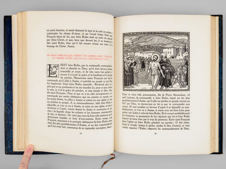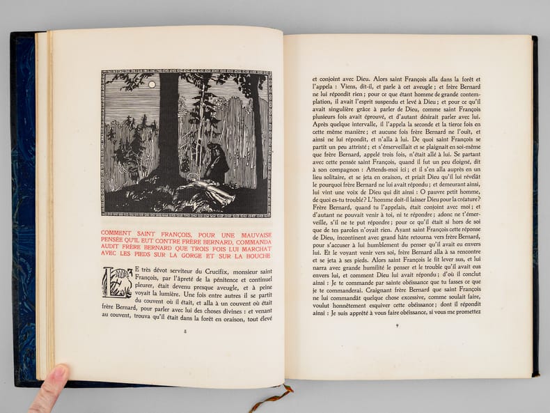 Traduites de l'italien par André Pératé, Illustrations de Maurice Denis gravées sur bois par Jacques Beltrand, exemplaire sur papier de hollande au filigrane Van Gelder Zonen numéroté a crayon rouge (n° 26), 1 vol. in-4 reliure demi-maroquin à coins bleu nuit, dos à 5 nerfs, tête dorée, couvertures et dos conservés, À l'Art Catholique, Paris, 1919, X-190 pp.