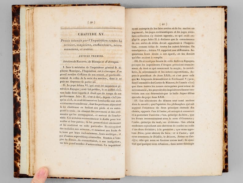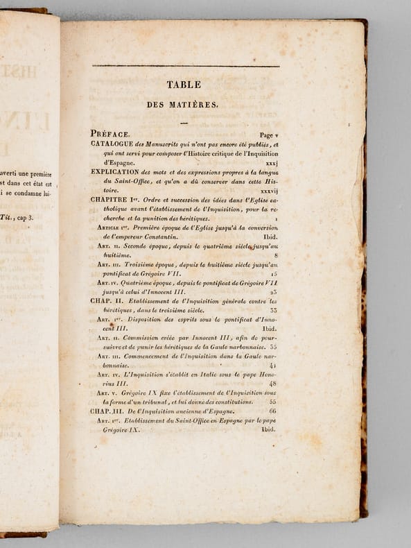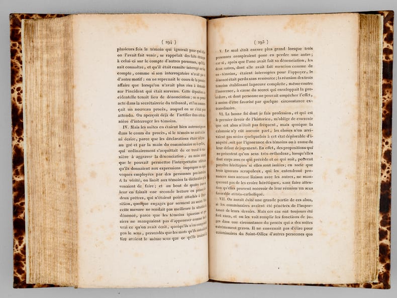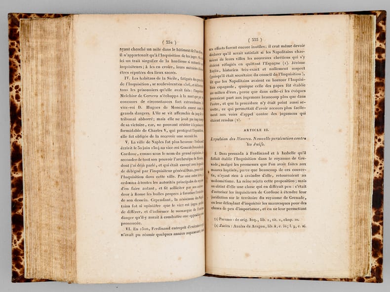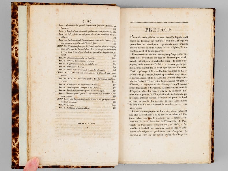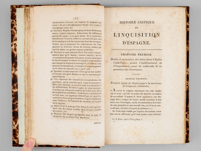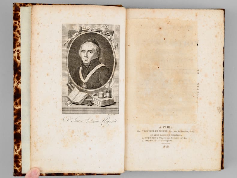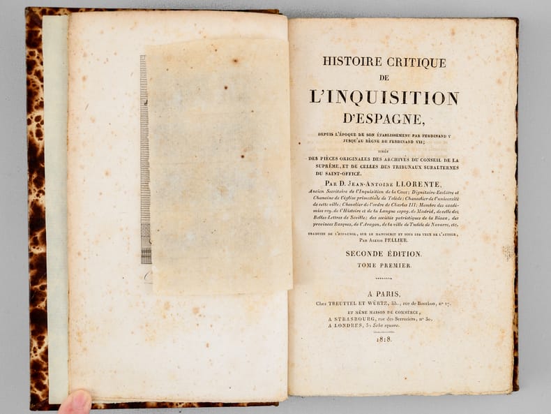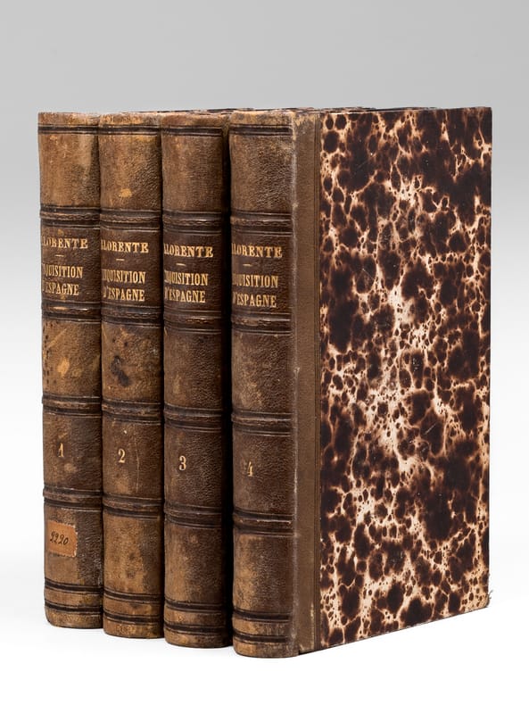Si les historiens ont depuis très grandement réduits le nombre de victimes alors imputées à l'Inquisition espagnole par le Père Llorente, son "histoire critique de l'Inquisition" connut une grande diffusion dans les milieux libéraux au lendemain de la Restauration, et son influence sur les esprits ne saurait être mésestimée. Bon état (dos un peu frotté avec étiquette de cote au dos du tome premier, qq. rouss.).