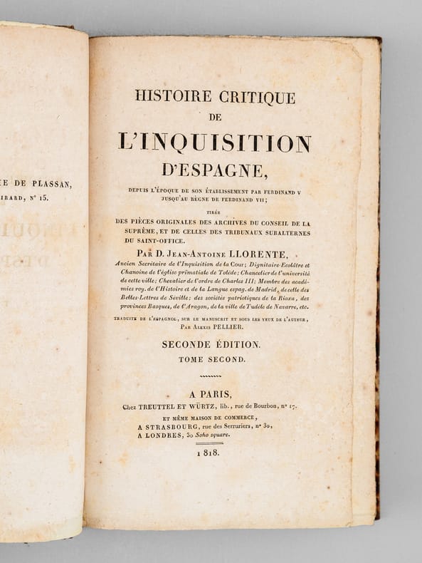Traduite de l'espagnol sur le manuscrit et sous les yeux de l'auteur par Alexis Pellier, Seconde Édition, 4 vol. in-8 reliure demi-chagrin brun, dos à 4 nerfs, Chez Treuttel et Würtz, Paris, 1818, L-493 ; 553 ; 497 ; 500 pp. Rappel du titre complet : Histoire critique de l'Inquisition d'Espagne (4 Tomes - Complet) Depuis l'époque de son établissement par Ferdinand V jusqu'au règne de Ferdinand VII, tirée des pièces originales des archives du Conseil de la Suprême, et de celles des tribunaux subalternes du Saint-Office