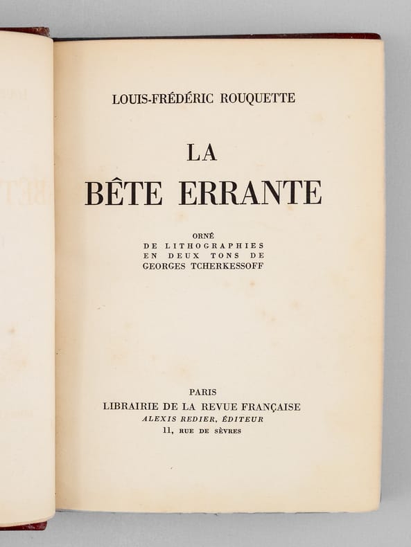 Paris A la Revue Française. A. Redier, éditeur (sans date) in 8 1 volume relié demi chagrin beu à coins, dos lisse orné de motifs géométriques dorés et à froid, tête dorée, couverture conservée, (Flammarion). Orné de lithographies en 2 tons par Georges Tcherkessoff. Rouquette Louis-Frédéric, romancier ''exotique'' né à Montpellier en 1884. Bel exemplaire ( Photographies sur demande / We can send pictures of this book on simple request )