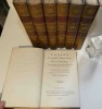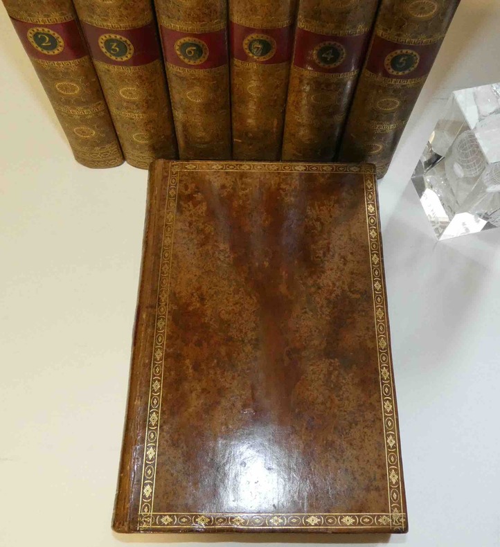 7 volumes in-8°et un volume in-4° pour l’atlas, reliés plein veau fauve raciné glacé, dos lisse décoré, pièce de titre de maroquin rouge, de tomaison dans un ovale de maroquin noir sur maroquin rouge, tranches dorées, frise d’encadrement dorée sur les plats, roulette sur les coupes, petite dentelle intérieure (frise et dents de rats), plats de papier caillouté, étiquette d'ex-libris contrecollées sur les plats du tome 1 et de l’atlas, XXIV + 382 p. - 4 f.nchf. et 568 p. - 4 f.nchf. et 560 p. - 4 f.nchf. et 564 p. - 4 f.nchf. et 543 p. - 4 f.nchf. et 564 p. - 4 f.nchf. et 511 p. - 4 f.nchf. et 130 p. + 1 f.nchf. et cccxxii + 1 f. nchf. Atlas : 27 planches telles qu’annoncées dans la table des planches. Attaques marginales de vers avec tout petit manque de cuir au mors du tome 4 et petit accroc avec infime manque au bas de la pièce de titre du même tome, petite épidermure au plat supérieur du tome 6 avec petit manque de cuir (frise d’encadrement disparue sur 1 cm) idem au tome 7. sinon très beaux exemplaires. Les 7 volumes de texte et l’atlas, non rapporté d’une autre édition, en reliure identique. Petites taches noires éparses sur le plat supérieur et petites rousseurs éparses. Petites rousseurs éparses. Très bel état pour ces ouvrages en reliure d’époque restauration hormis défauts signalés.