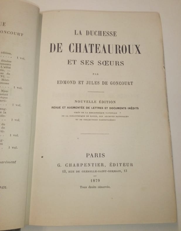 Ernest flammarion 1934 392 pages in12. 1934. Broché. 392 pages. Edmond et Jules de Goncourt. La Duchesse de Châteauroux et ses soeurs. Avec des lettres et documents inédits tirés de la Bibliothèque nationale de la bibliothèque de Rouen des Archives nationales et des collections particulières. Postface de M. J.-H. Rosny aîné