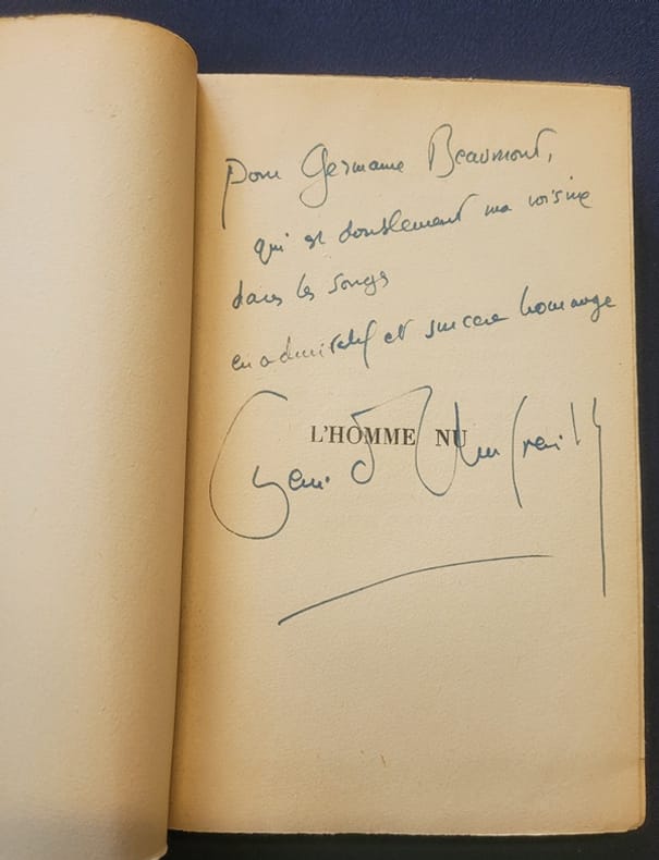 Paris Grasset 1955 In8 - broché - non coupé - 185 pages - Envoi autographe signé de l'auteur à Germaine Beaumont éditrice et critique . Henri d'Amfreville ( 1905/1964) est un romancier, poète et peintre français. Il collabore à La Revue Française et il est l'auteur de plusieurs ouvrages : Terre de rêve, Les fanatiques (1937), Les solitaires (1943), L'homme nu (1955), Le naufrage des sexes (1957), Eoliennes : épopée de l'air (1968). Il a exposé ses oeuvres picturales dans différentes galeries, dont la Galerie Bernheim .