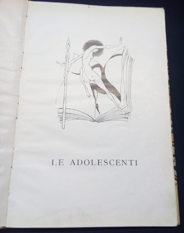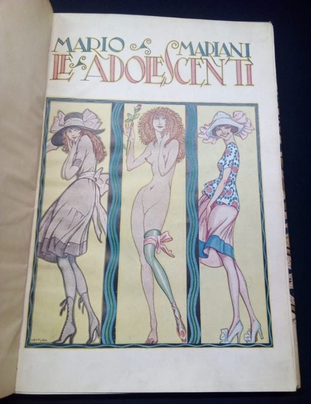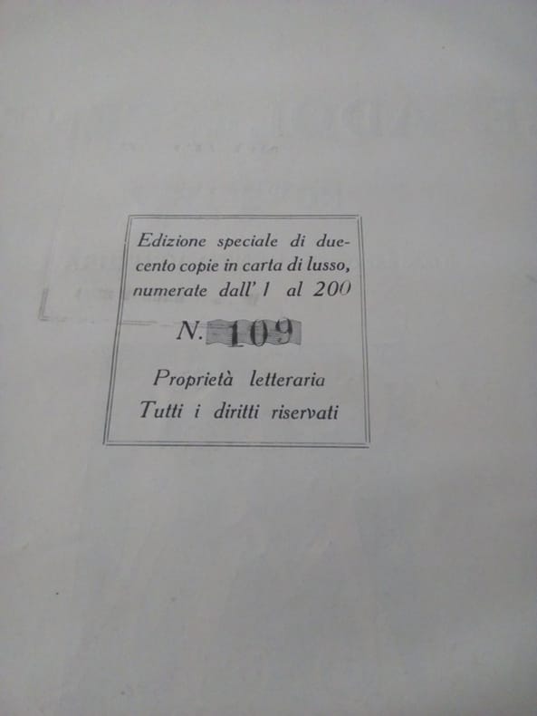 Milan Modernissima Casa Editrice Italiana 1919 In4 ( 30 x 20 cm ) - demi vélin à coins - dos lisse orné de filets dorés - couvertures conservées - 106 pages - 2ff - imprimé sur papier de luxe numéroté 109/200 - Couverture illustrée en couleurs - 1 illustration en frontispice + 10 grandes illustrations en tète de chapitres et 10 culs de lampes - En Italien . Double envoi de Mariani et de Ventura en page de garde à Suzanne Armelle , actrice et metteuse en scène . Trés rare édition originale . Le livre fut interdit et saisi et l'auteur condamné pour outrage à la pudeur . Les éditions suivantes furent expurgées de la partie intitulée " Maria Veraldi " . Mario Mariani ( 1884/1951) , anarcho-jouisseur , s'était spécialisé dans la littérature dérangeante . A l'avènement du fascisme il s'installa en France puis émigra au Brésil .