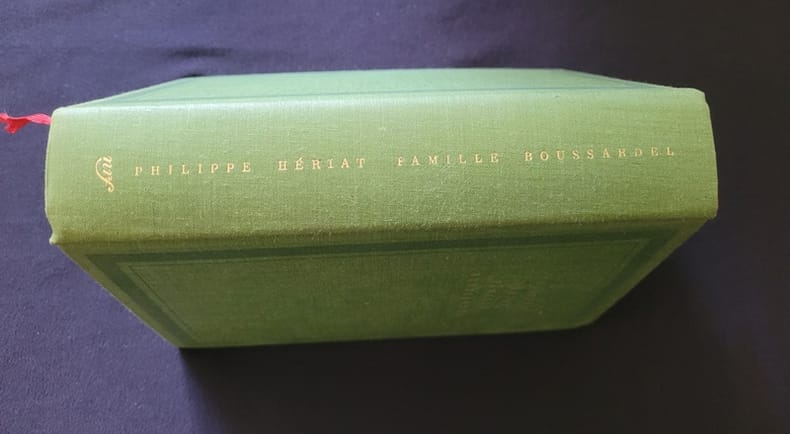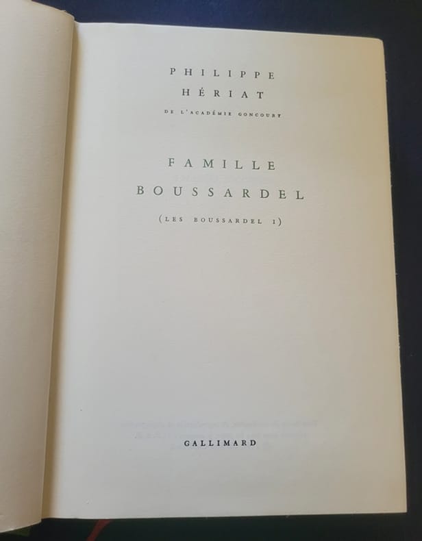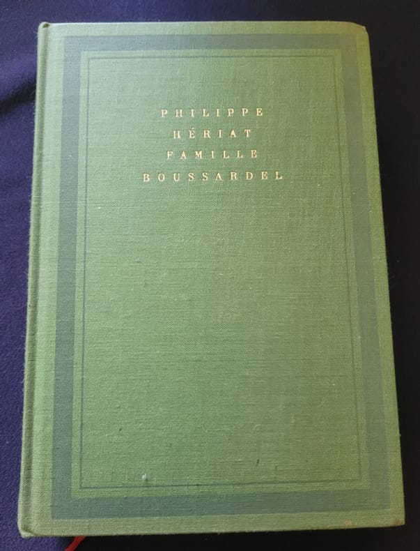 Titre : Famille Boussardel Auteur : Hériat Philippe Éditeur : Gallimard Collection : nrf - Collection blanche Lieu : Paris Date : 1947 Langue : français Reliure : Demi-chagrin rouge, dos lisse encadré de filets dorés avec titre doré, plats de papier marbré rouge, signet de soie conservé Format : env. 19 x 12 cm État : Bon état d'usage - frottements aux coiffes et aux mors, coins émoussés, petits éclats sur le papier des plats, papier uniformément bruni, pli visible au faux-titre et à la page de titre, intérieur propre Note : Mention d'édition indiquée dans l'ouvrage ; copyright 1944, dépôt légal 1946, achevé d'imprimer le 26 juin 1947. Page de tirage précisant des exemplaires sur vélin Navarre et sur alfa, reliés d'après une maquette de Paul Bonet