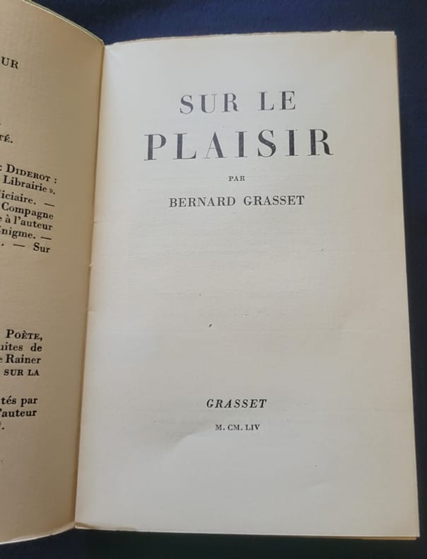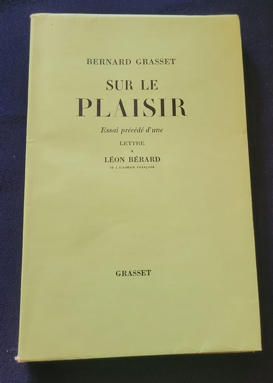 État : Très bon état - Année : 1954 - Format : in 12° - Pages : 98pp - Editeur : Grasset - Lieu d'édition : Paris - Type : Broché sous couv rempliée. - Divers : frottement avec un très petit manque en queue du dos. Plis de lecture au dos. Toute petite tâche sur le premier plat. - Commander rapidement : https://www.bons-livres.fr/livre/bernard-grasset/5159-sur-le-plaisir-essai-precede-d-une-lettre-a-leon-berard?lrb