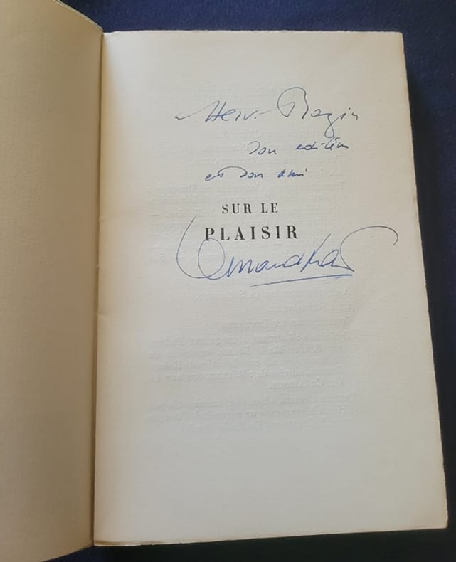 ˮLe mot plaisir, pris isolément, s'entend, de façon exclusive, de ce qui contente nos sens; ce qui lui vaut, sans doute, d'être suspecté. Plaisir suppose attrait, chose qui tente, et dont la seule poursuite donne à jouir. En somme, qu'on désire.ˮ Edition originale de ce petit ouvrage paru en 1954. Exemplaire du service de presse numéroté sur vergé Johannot (n°101/800) avec un envoi de l'auteur au professeur (de médecine) Leriche (1879-1955).