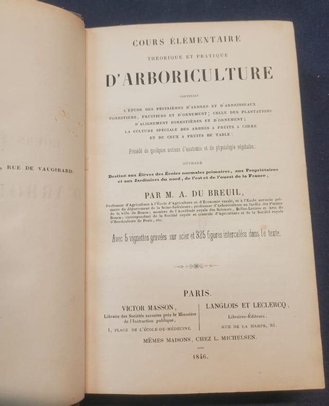 La première édition parut en 1846.Alphonse Du Breuil (1811-1890), horticulteur français, est l'auteur d'une abondante littérature spécialisée d'arboriculture, d'arboriculture fruitière et de viticulture, arbres d'alignement, jardins potagers et d'ornements. Pédagogue, son enseignement s'est adressé autant aux professionnels qu'aux amateurs. Il fut le premier directeur de l'École Du Breuil, fondée par Haussmann en 1867, et devenue l'école d'horticulture de la ville de Paris. - - VENTE PAR CORRESPONDANCE UNIQUEMENT - LIEN DE PAIEMENT, NOUS CONSULTER.
