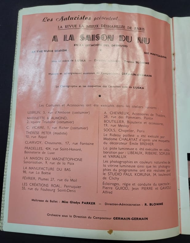 0 Programme petit In4 de 32 pages - nombreuses photographies de nus - couverture illustré par Siné ainsi que 1 page intérieure - 2 pages avec défauts - Ce cabaret se trouvait place Pigalle dans les années 1950.