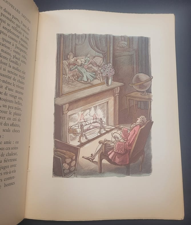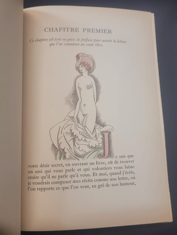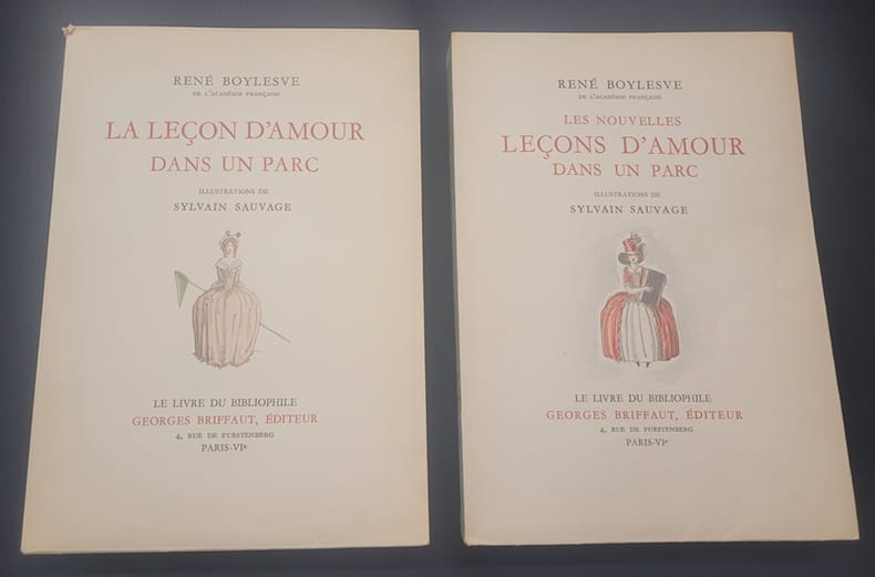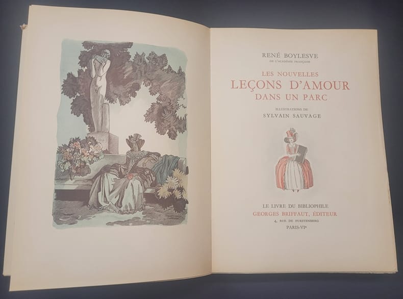 Paris Georges Briffaut 1939-1941 1939 Deux volumes in-8° (230 x 162mm), (6) 213 pp. et (4) III 204 (3) pp. Reliure en demi-peau imitation vélin, dos lisses orné, dos et couvertures conservé.e.s, signet (reliures modernes). Frontispice et illustrations in et hors-texte de Sylvain Sauvage. Tirage à 1670 exemplaires, un des 1500 exemplaires sur vélin bibliophile numérotés (n° 185). Le premier volume est illustré de gravures en couleurs tirées en taille-douce sur les presses à bras de Leblanc et Trautmann. L'éditeur ne jugeant pas satisfaisant le résultat d'homogénéité de la Taille-douce pour le premier volume, a fait exécuter les gravures du tome deuxième en bois gravés. Intérieur frais.