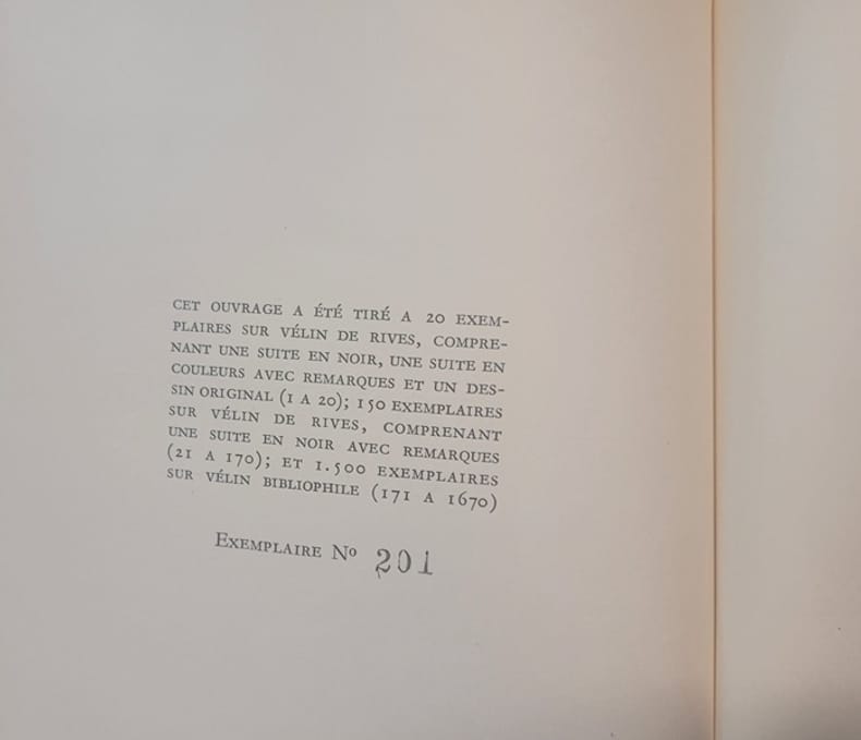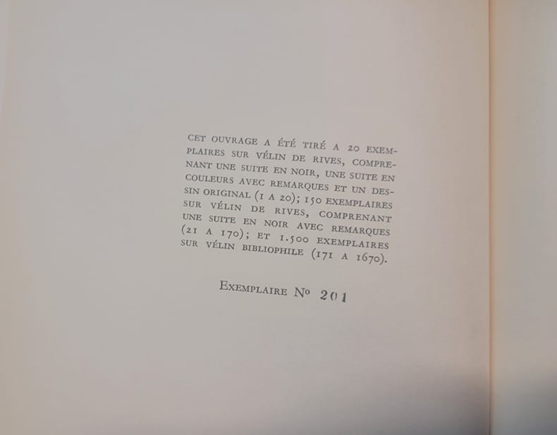 Illustrations de Sylvain Sauvage. Ouvrages tirés à 150 exemplaires num. sur Vélin de Rives, comprenant une suite en noir avec remarques (21 à 170). Ex. n° 34. Classification Dewey : 96.5-Curiosa