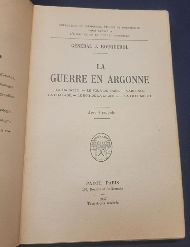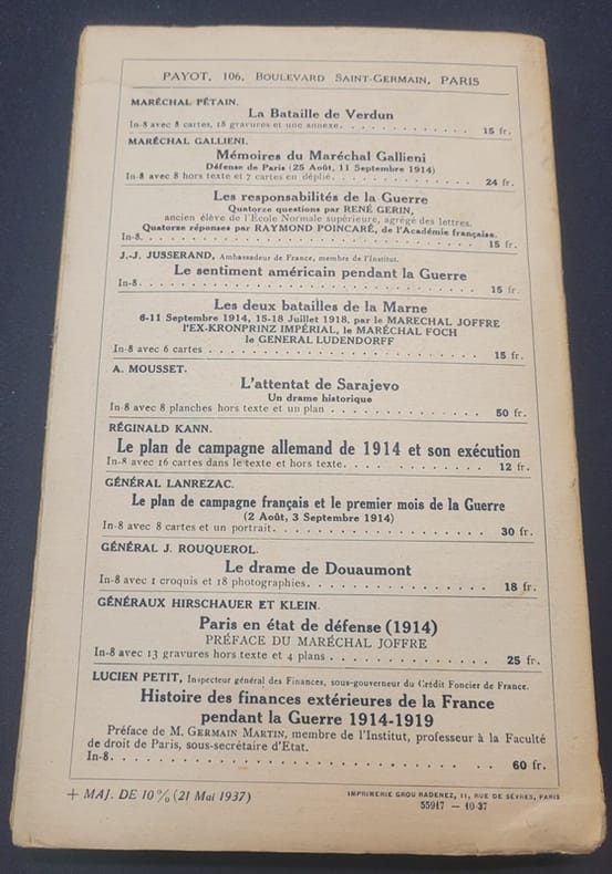 Paris Payot 1937 Grand In8 - broché - 198 pages - cartes hors texte - nombreux passages soulignés au crayon de bois certainement par un ancien combattant - petit accroc et petite tache a la coiffe inférieure . -