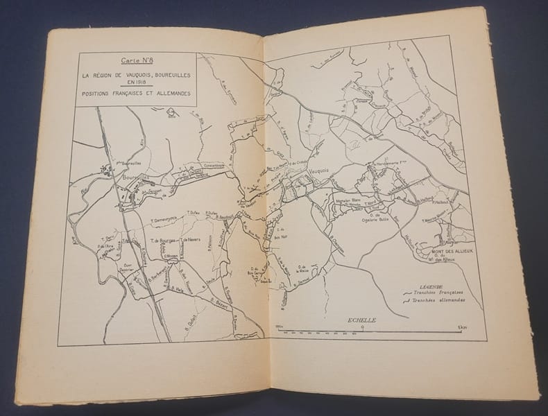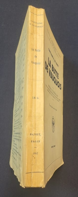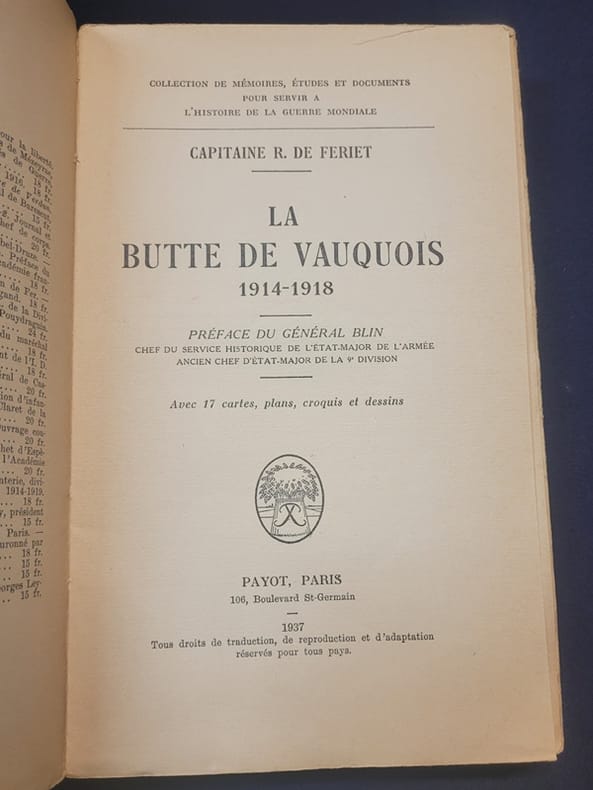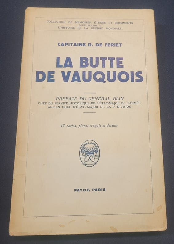 Payot, 1937, in-8 br. (14 x 22,5), 215 p., coll. "Mémoires, études et documents pour servir à l'histoire de la guerre mondiale", préface du général Blin, 17 cartes, plans, croquis et dessins, bon état (on joint deux coupures de presse : "Comment nous sommes entrés à Vauquois", La Dépêche 15 mars 1915 et une photo de "Ce qu'il reste d'un village français")
