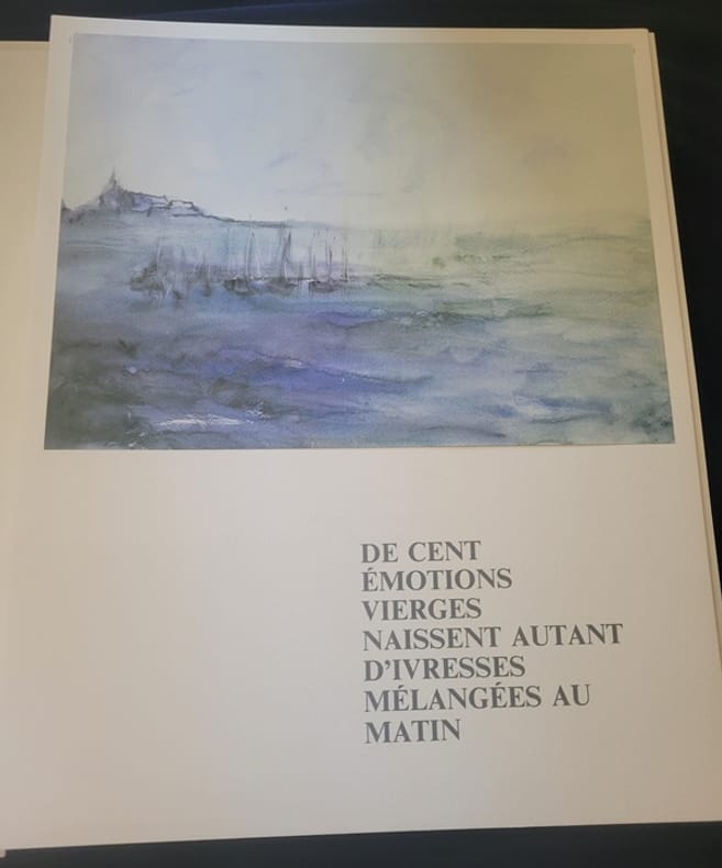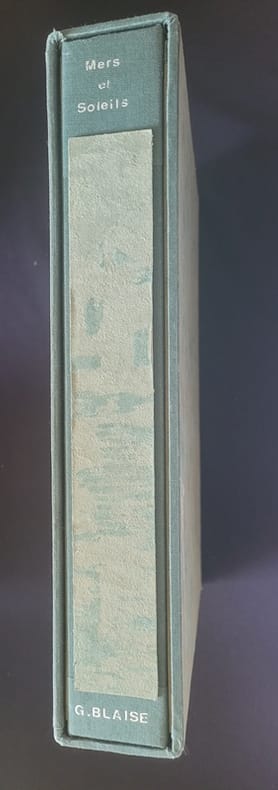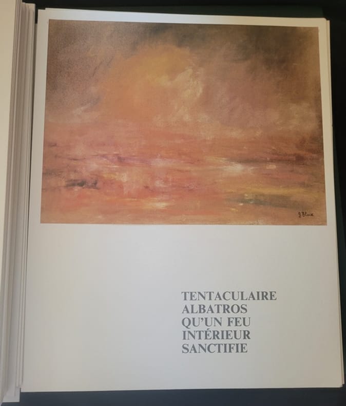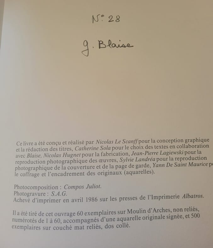 Albatros 1986 Grand In4 ( 34 X 28 cm ) - en feuilles sous chemise et emboîtage - Ensemble de textes et poèmes des grands écrivains Français illustrés par G. Blaise - Une aquarelle originale enchâssée dans la chemise - 5 lithographies signées et nombre de reproductions photographiques de l'artiste - Tirage à 560 Ex. celui ci numéroté 28/60 , l'un des 60 avec une peinture originale . Geneviève Blaise Née le 28septembre1921 , à Tournus.et décédée en 2011 se forma en art à l'École Nationale des Arts Décoratifs de Paris entre 1940 et 1943. Elle a contribué à la décoration du paquebot France, réalisant une décoration florale sur 44 panneaux.