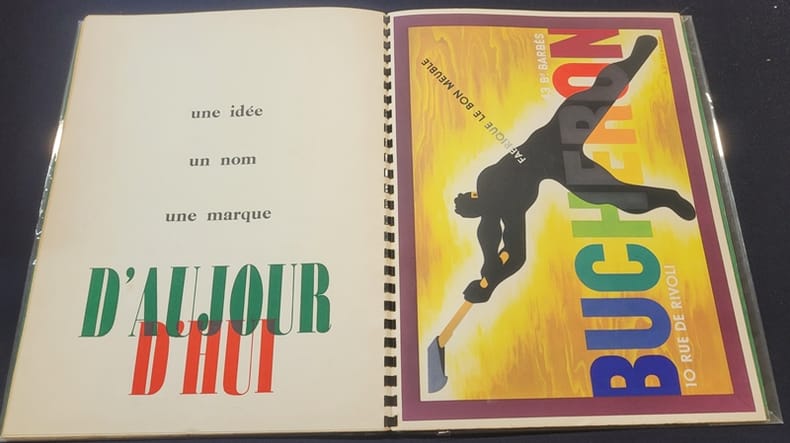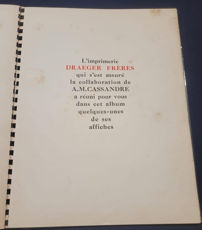 Montrouge Draeger 0 s.d. [1935]. In4, non paginé, reliure plastique SGDG, couverture blanche, titre en partie gaufré, en partie imprimé en rouge, noir, vert, dans une large typographie entretenant l'effet de relief - 15 affiches de A.M. Cassandre reproduites en noir et blanc ou en couleurs , introduction de Blaise Cendrars imprimée en vert, rouge et noir, pour le texte, beau travail typographique en 3 couleurs - Quelques rousseurs aux premiers feuillets et aux plats particulièrement au 4e . Recueil célèbre composé de la reproduction de 15 affiches, dont quatre en couleurs de l'artiste Cassandre, dont le texte de Cendrars fait l'éloge "... je lui suis reconnaissant d'avoir découvert dans la publicité la fleur de la vie contemporaine, [...] une affirmation d'optimisme et de santé, la plus chaleureuse manifestation de la vitalité des hommes d'aujourd'hui..." On y retrouve les plus célèbres de ses affiches : celle du Normandie ou de l'Étoile du Nord (grand prix de l'affiche de 1927) , "Au bûcheron" (primée à l'Exposition internationale des arts décoratifs), et encore l'affiche en trois partie pour Dubonnet. Sans doute une des plus belles publications publicitaires jamais réalisées.