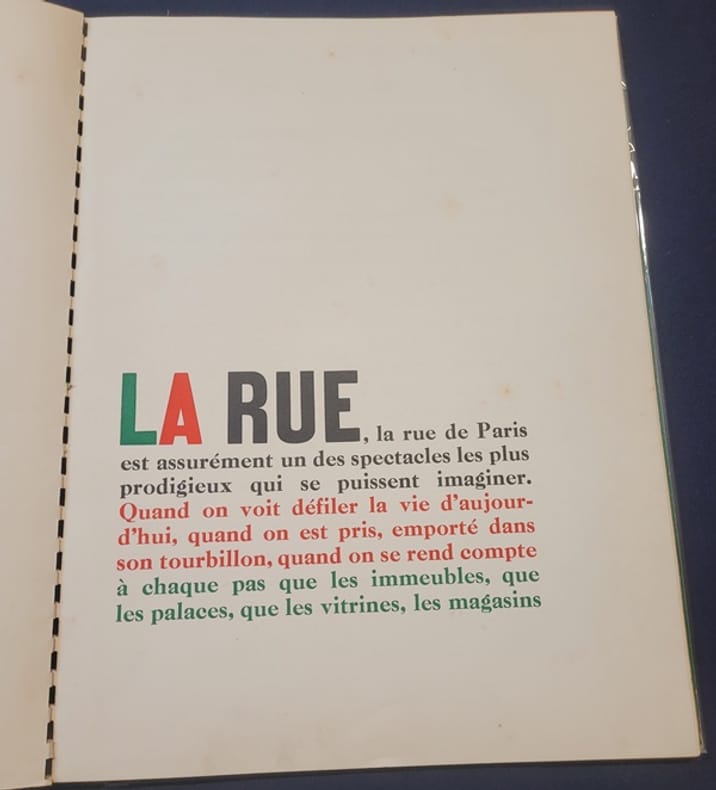 Paris Draeger, s.d. [1935] 1 vol. Broché in-4, reliure spirale, plats de papier crème avec sur le premier le début du titre gaufré et le mot "rue" imprimé en trois couleurs, vert noir et rouge, doublures vertes, gardes rouges, non paginé (40 pages). Superbe plaquette en hommage au grand affichiste Cassandre : 15 planches reproduites en noir et en couleurs accompagnées d'un texte de Cendrars en originale, dans une typographie virtuose, qui fait alterner le rouge, le vert et le noir, et joue sur la taille des caractères et la disposition du texte. Très belle réalisation, l'un des chefs-d'oeuvre de l'art publicitaire. Très légères marques de brunissure sur les plats, sinon exemplaire en excellente condition.