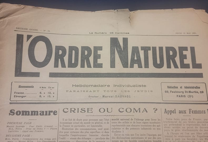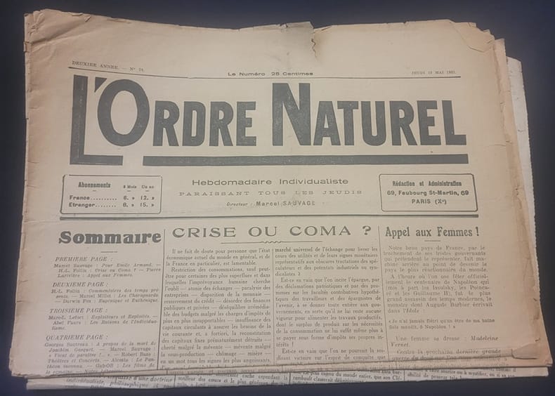 0 3 Numéros - Format In folio - Hebdomadaire puis bi-mensuel - Nombre total de parution incertain - les 3 numéros comportent des déchirures sans manque - C'est Émile Armand et Marcel Sauvage qui en furent les animateurs principaux .