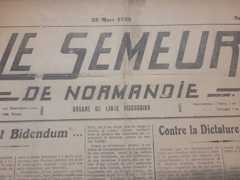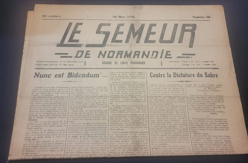 0 6 Numéros - N. 37 du 25 Fevrier 1925 / N. 38 du 28 Janvier 1925 ( erreur de numérotation ? ) / N. 38 du 11 Mars 1925 / N. 39 du 25 Mars 1925 / N. 49 du 21 Octobre 1925 / N. 50 du 27 Octobre 1925 - Tous les numéros en bon état sauf le N. 113 avec un manque - In folio - 4 pages Ce journal eut 50 numéros de 1923 à 1925 - Il était imprimé a Dives/ Mer puis a Falaise - C'est principalement E. Poulain , E. Gregoire et Lucien Benizet qui en étaient les rédacteurs - Il continua sa parution ensuite sous le nom Du Semeur contre tous les tyrans .