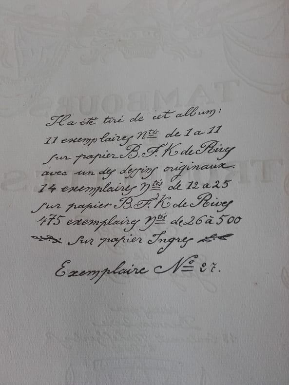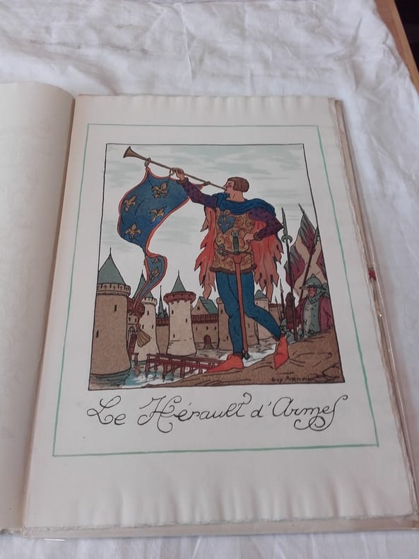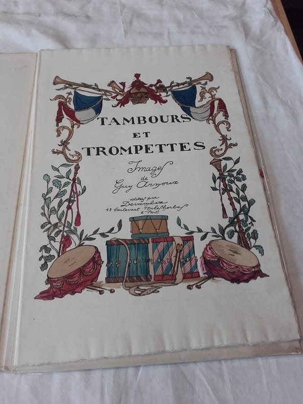Devambez Paris, Devambez, sans date, 1919. In-Folio en feuillets de 10 planches, page de titre en couleurs et page de justification de tirage. Recueil de 10 planches coloriées au pochoir : le Tambour des Mousquetaires, les Trompettes du Roy, le Tambour des Gardes, les Tambours de la Liberté, la grande Caisse de la Garde, le Tambour du Camp de Châlons, etc. Edition originale tirée à 500 exemplaires numérotés, celui-ci sur Ingres. Bel exemplaire.
