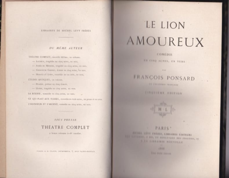 Paris Alphonse Lemerre, Editeur 1885 in 12 (18,5x12) 1 volume reliure demi basane rouge de l'époque, dos à nerfs orné de petits fleurons dorés, pièces de titre de cuir noir, 223 pages [1]. François Coppée, 1842-1908. Relié à la suite: LE LION AMOUREUX. Comédie en cinq actes, en vers par François Ponsard (Paris, Michel Lévy 1874), 116 pages. Bon exemplaire ( Photographies sur demande / We can send pictures of this book on simple request )
