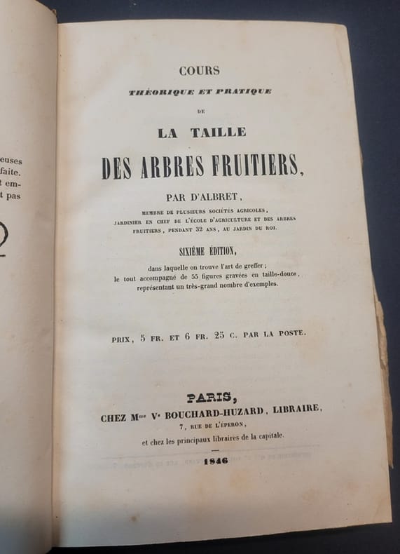 Paris, Bouchard-Huzard, Paris, Bouchard-Huzard1842 ; in-8, demi-basane verte, filets dor., tr. marbr. (Rel. de l’époque). 2 ff., IV pp., 286 pp. - 7 planches dépliantes portant 32 gravures en taille-douce.Edition augmentée d’un manuel célèbre. La première édition est de 1829. D’Albret était jardinier en chef de l’École d’Agriculture et des arbres fruitiers du Jardin Royal.Bel exemplaire bien relié.