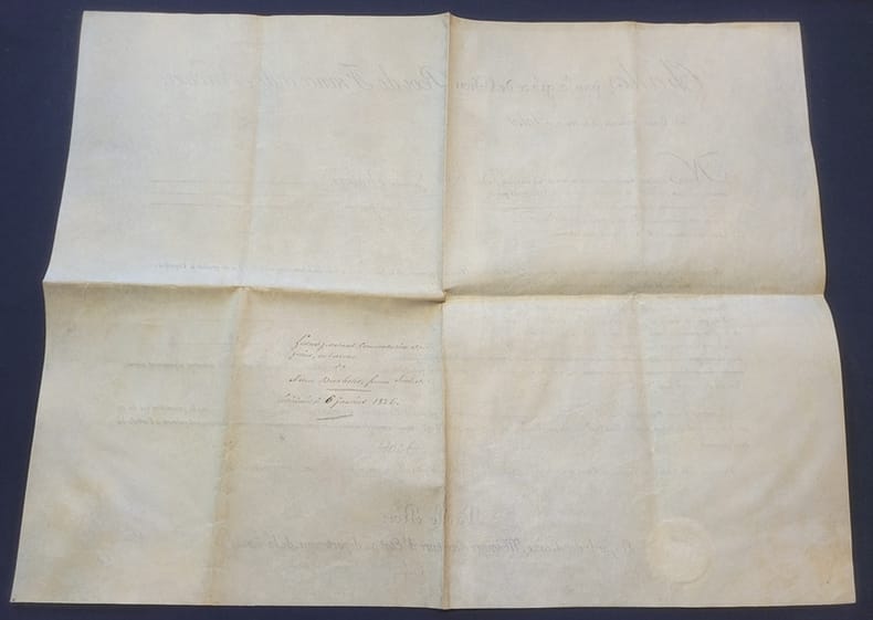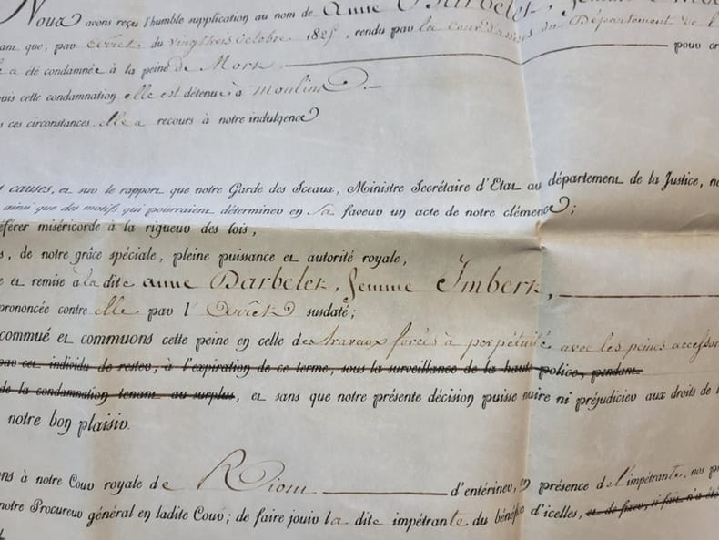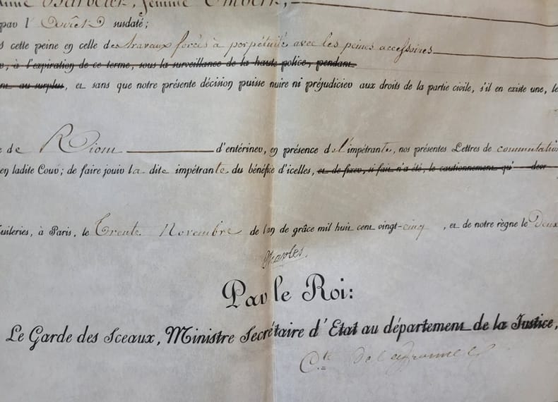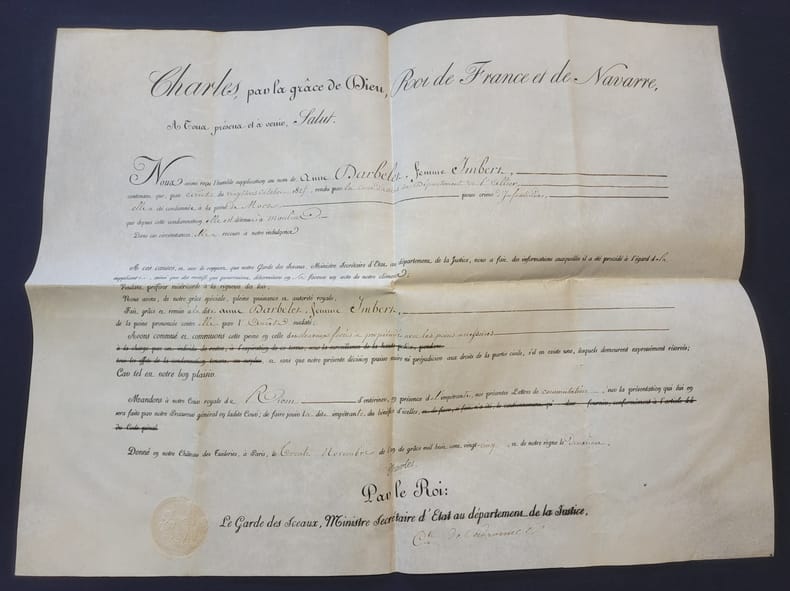 1825 Imprimée sur peau de vélin - format 57 X 44 cm - En partie manuscrit - La condamnée a mort le fut le 23 Octobre 1825 pour Infanticide a Moulins ( Allier ) . Charles X commute la peine en travaux forcés a perpétuité ... Signée par Charles X ( secrétaire ) et contre signée par le Comte Pierre-Denis de Peyronnet alors Garde des Sceaux ; Cachet en papier de la chancellerie . En Date de Novembre 1825 . Déjà pliée sera envoyée pliée .