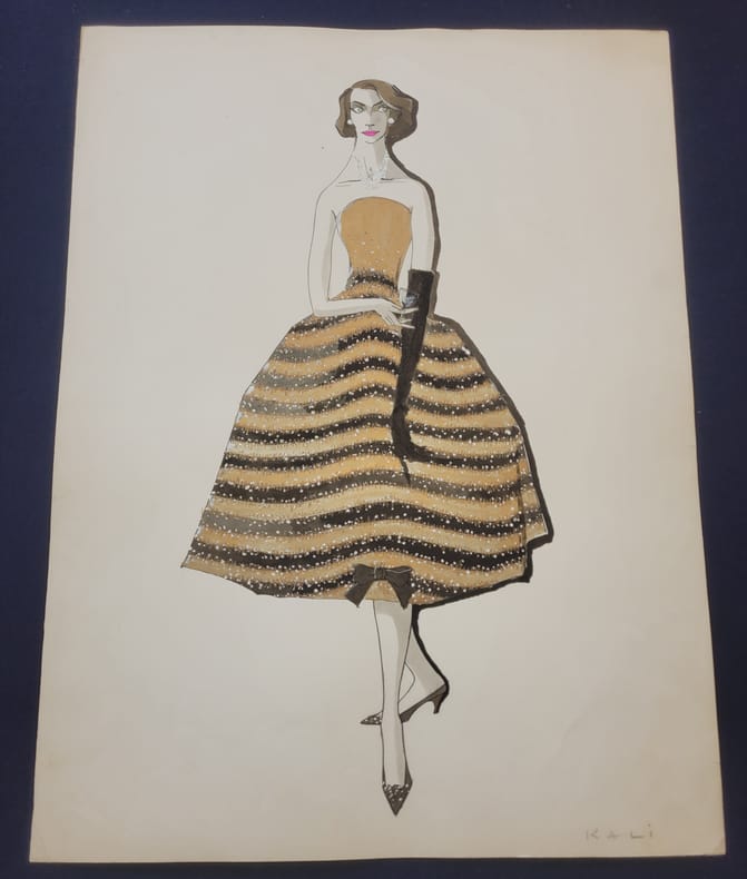 0 Format 49 X 37 cm - Crayon et aquarelle non signée - modèle appelé Dante . Bob Bugnand, né Antoine Bugnand, a débuté sa carrière en créant pour Jacques Heim et Robert Piquet. Il a ouvert sa propre maison de couture à Paris dans les années 1950, puis une boutique à New York, où il était apprécié des femmes de la haute société, à la recherche de robes et de costumes sur mesure. Sa boutique produisait 50 créations originales chaque mois pour des clients privés, ce qui le rendait populaire auprès de celles qui recherchaient la mode française sans avoir à voyager outre-Atlantique. Ses costumes à la coupe élégante étaient portés par des personnalités comme Jacqueline Kennedy.