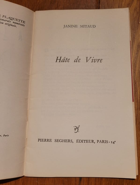 Paris Seghers 1949 Collection P.S.- In12 - broché - 34 pages - Envoi autographe signé de l'auteur à Jean Marcenac . Janine Mitaud ( 1921/2011) fut de toutes les aventures poétiques de la 2e moitié du 20e siècle .ses collaborations furent nombreuses et elle fut éditée dans de nombreuses revues .