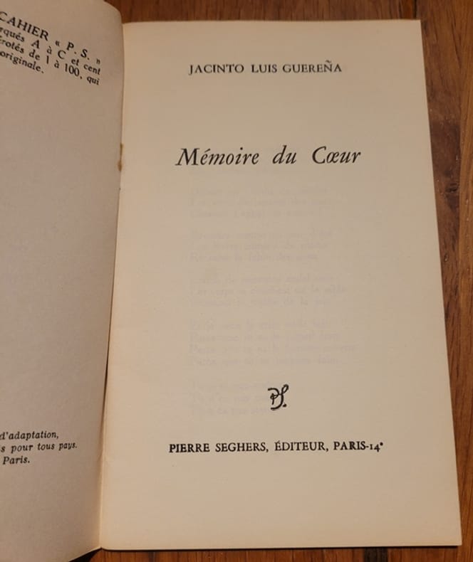 Paris Seghers 1953 Collection P.S.- In12 - broché - 40 pages - Envoi autographe signé de l'auteur à Jean Marcenac . Jacinto Luis Guerena , poète et critique littéraire espagnol (Buenos Aires, 1915 - Madrid 2007), arrive en France après l'effondrement de la République où il connaît les camps d'internement. Libéré, il occupa divers postes d'enseignant à Pau où il fonde la revue Méduse (1945-1947), puis à Toulon. Il collabora activement aux revues Esprit , Europe , etc...