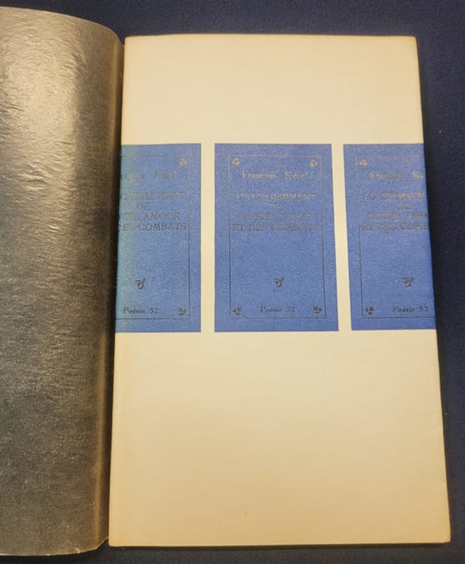 Paris Seghers, coll. "Poésie 52" 1952 1 vol. broché plaquette in-12, agrafée, couverture à rabats en couleurs sur fond crème, 29 pp. Edition originale. Envoi de l'auteur à G.-E. Clancier. Dos et couverture légèrement jaunis, sinon bon état.