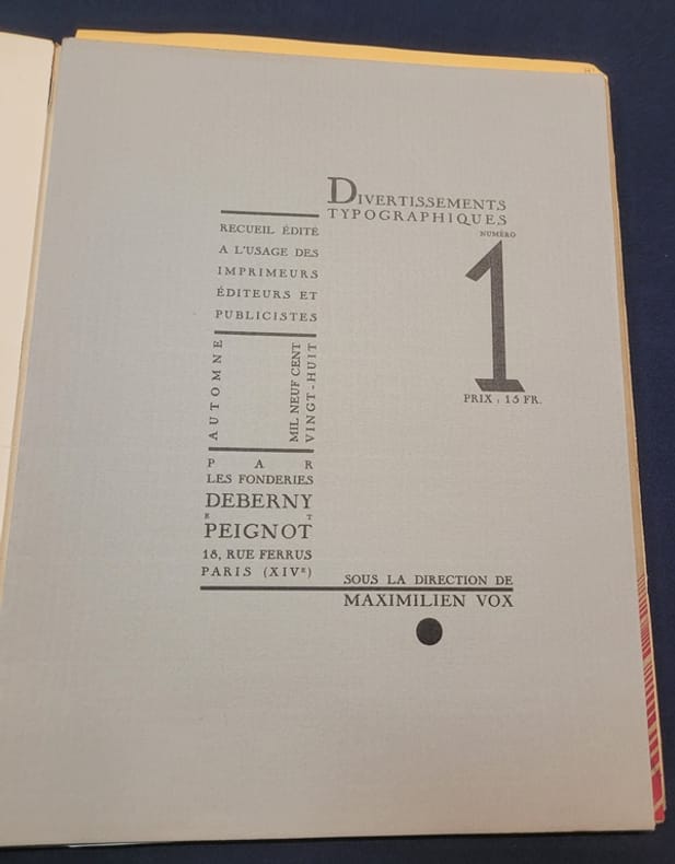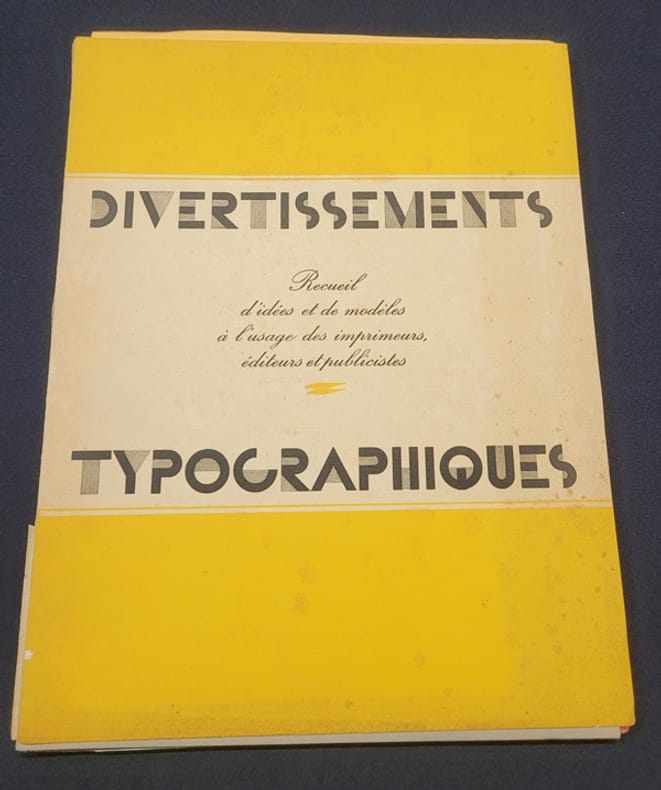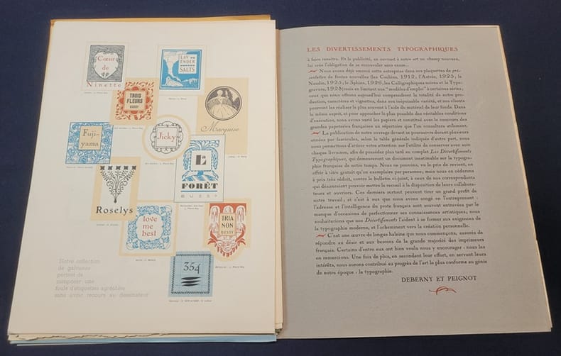 Deberny et Peignot 1930 In4 - en feuilles sous chemise illustré - contient 1 feuillet de 4 pages d'explications et commentaires - 10 feuille simples sur différents papiers imprimées d'un seul coté ou recto-verso , 4 feuillets doubles imprimés - Nous ne garantissons pas que l'ensemble soit complet . Il est sorti 5 fascicules des Divertissements typographiques 6 Sous la direction de Maximilien Vox .