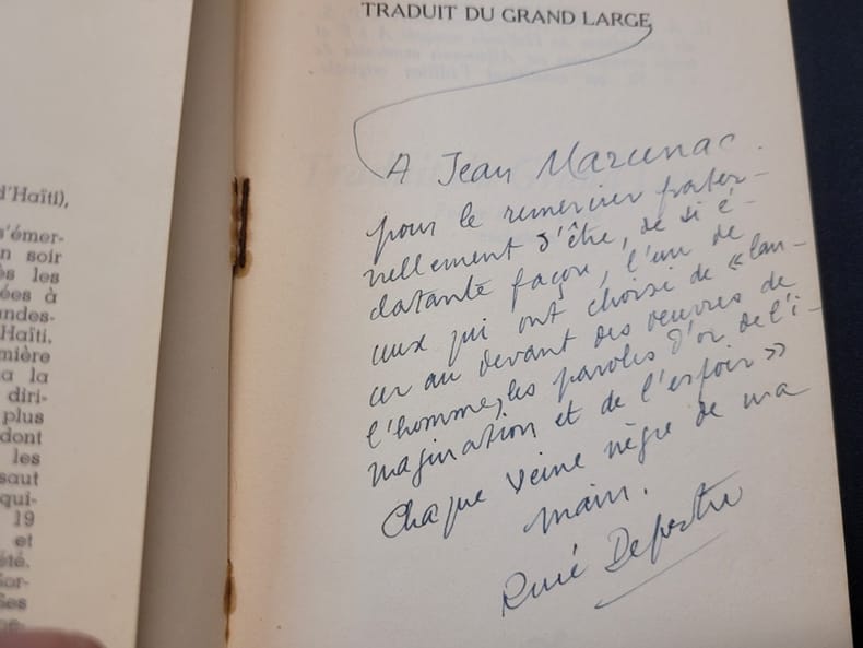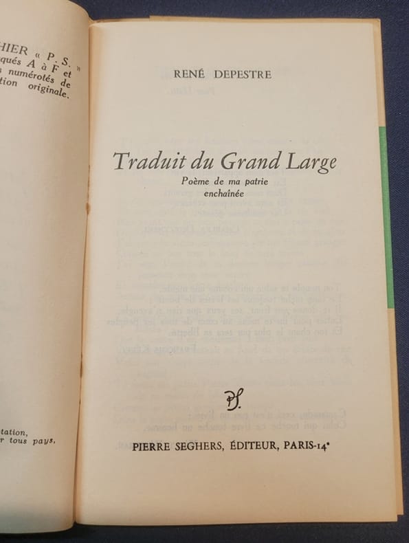 Paris Seghers 1952 Collection P.S.- In12 - broché - 57 pages - Envoi autographe signé de René Depestre a Jean Marcenac . René Depestre , Haitien d'origine dut fuir son ile en 1945 , il fut un compagnon du Che mais rompit avec le régime castriste ; Il vit en France depuis les années 80 .
