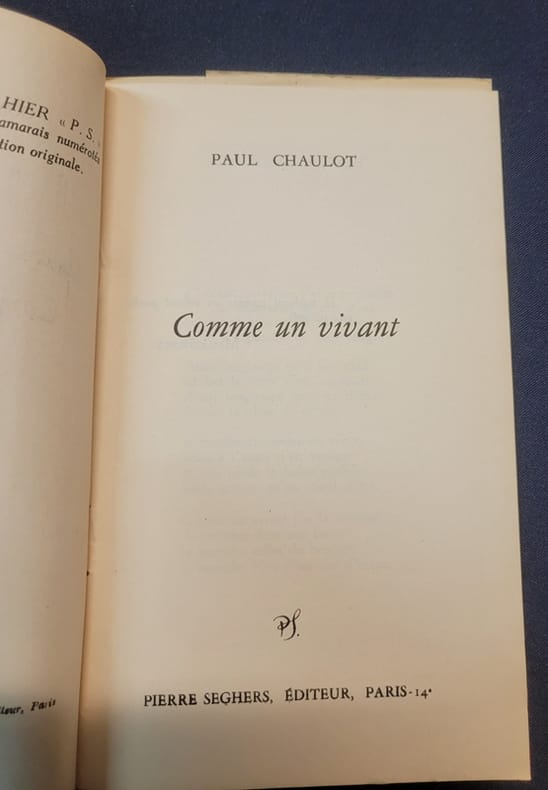 Paris Seghers 1950 Collection P.S.- In12 - broché - 34 pages - Envoi autographe signé de Paul Chaulot a Jean Marcenac . Paul Chaulot ( 1914/1969) fut poète et chroniqueur dans de nombreuses revue littéraires .