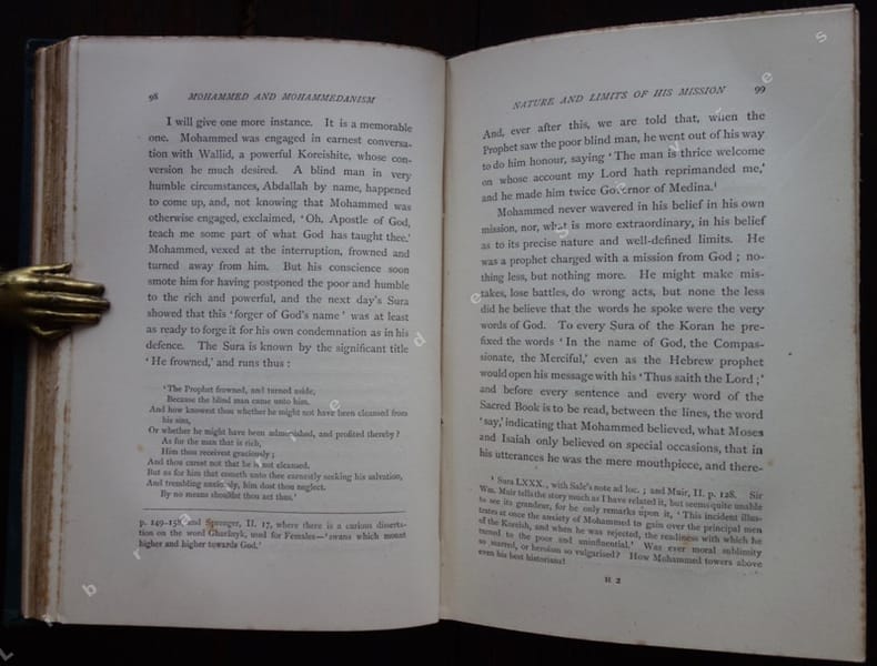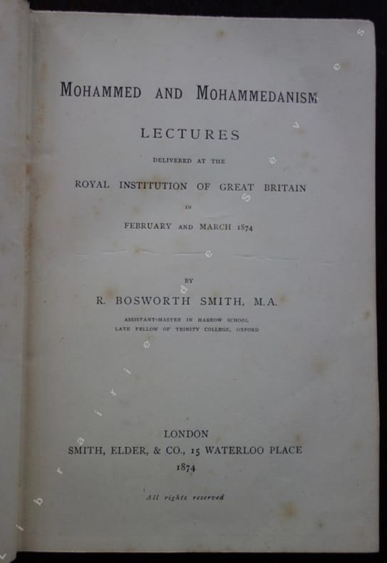Éd. orig. Benjamin Bosworth Smith (1794-1884) fut diplômé de la Brown University en 1816.En 1832 il devint évêque du diocèse. Président de Bishop (à partir de 1868), un mouvement séparatiste, devenu l'Église épiscopale réformée. Sur Mahomet il écrit : "Il était César et le Pape réunis en un seul être ; mais il était le Pape sans avoir les prétentions du Pape, et César sans avoir les légions de César : sans armée, sans garde du corps, sans palais, et sans revenu fixe ; s’il y a un homme qui a le droit de dire qu’il règne par la volonté divine, ce serait Muhammad, puisqu’il a tout le pouvoir sans en avoir les instruments ni les supports", (p. 235).