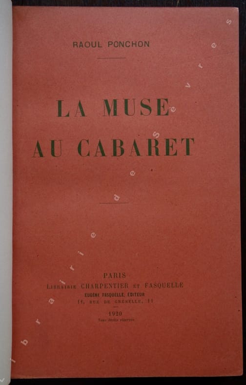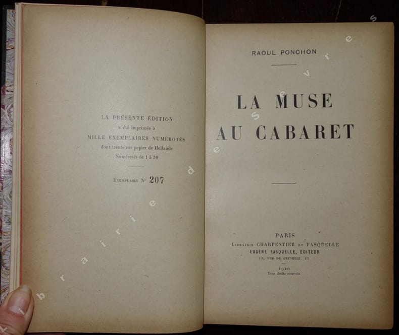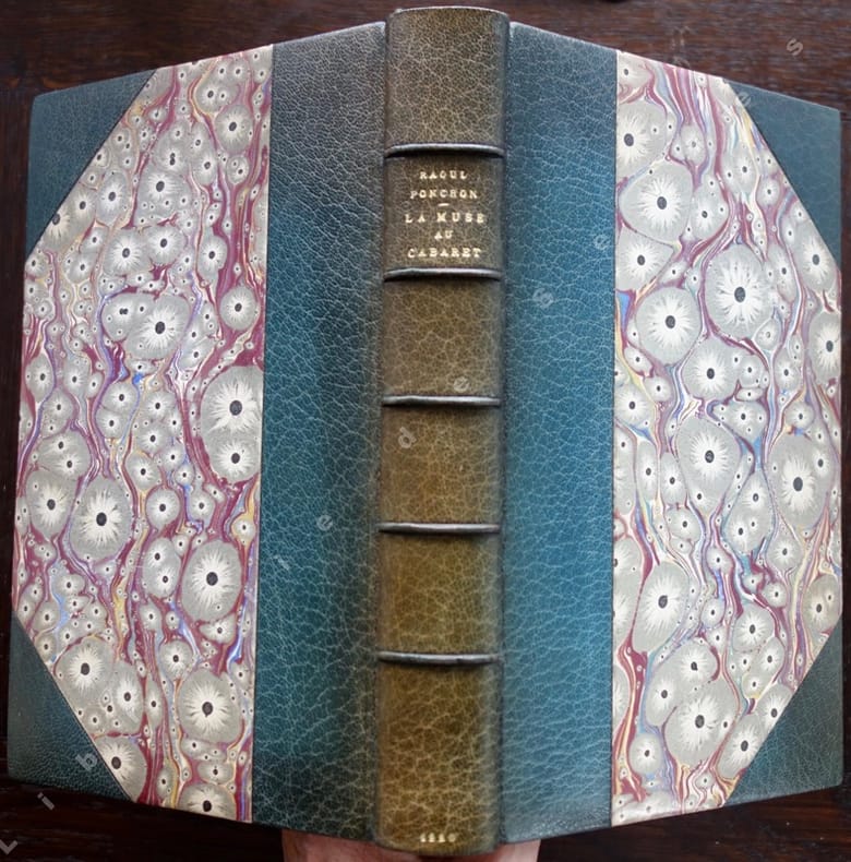 Exemplaire revêtue d'une délicate reliure du temps. Un des exemplaires numérotés du tirage sur vélin blanc de cette ''édition recherchée''. (in Carteret). Il s'agrémente - ici en premier tirage - de compositions hors-texte et en couleurs de Lucien Boucher. ''L'oeuvre d'illustrateur de cet artiste particulièrement recherché des écrivains autant pour sa verve que pour sa fidélité à l'esprit des textes, est considérable''. (in Bénézit). ''Esprit sain et ingénu lorsqu'il ouvre les yeux sur le monde, il y constate une telle abondance de spectacles singuliers où se côtoient le fantastique et le comique, qu'il n'a qu'un seul souci : les exprimer''. (in 5.000 dessinateurs de presse). ''Plus célèbre des recueils de Raoul Ponchon. Ce fantaisiste avant l'école fantaisiste, ce poète-biberon à la manière de Saint-Amant, joyeux, bachique, prêt à la satire, rassembla le meilleur de son oeuvre dans La Muse au cabaret. Sans nul doute, voici le recueil le plus important consacré au vin, aux cabarets et aux ripailles''. (in Oberlé). Carteret V, Le Trésor du bibliophile / Illustrés modernes, p. 159 - Oberlé, Une bibliothèque bachique (pour l'originale de 1920 chez Fasquelle) - Bénézit II, Dictionnaire des peintres, p. 212 - Saint-Martin, 5.000 dessinateurs de presse, p. 98. Dos légèrement passé présentant en outre quelques altérations superficielles. Du reste, très belle condition.