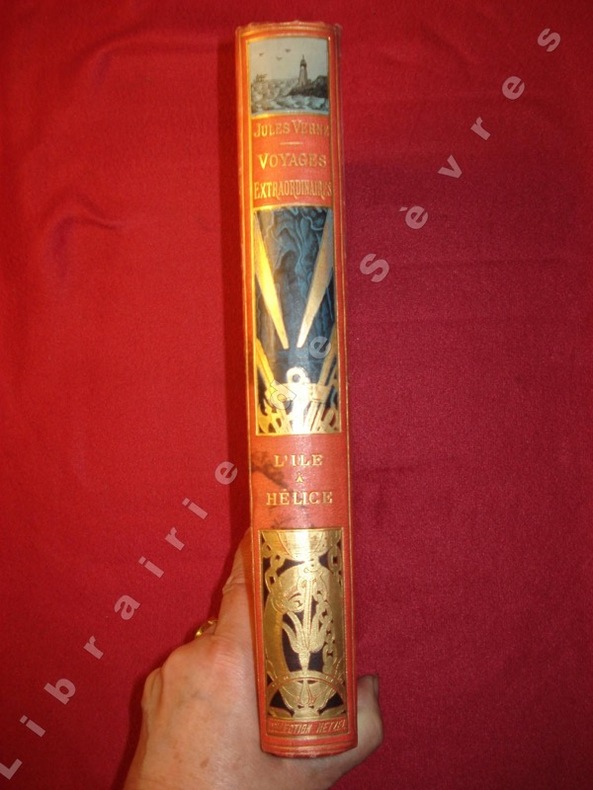 Edition originale illustrée de 80 dessins par Benett et 12 hors-texte en couleurs. Catalogue D pour 1895 attestant de la première édition. Cartonnage d'éditeur dit "Au portrait collé". Plaque signée Paul Souze sur le boulet. Lenègre et cie en queue du dos et sur l'ancre. Très belle première plaque. Coins très légèrement repliés. Dos bien, avec une tache blanche dans la pièce de titre et une zone grattée dans la vignette au phare. Coiffes affaissées. On remarquera que la vignette au phare n'est plus bleu ciel mais bleu nuit. Second plat bien, mais zones plus sombres et un point blanchâtre. Exemplaire gauchi, un feuillet ressorti. Papier remarquablement frais, totalement exempt de rousseurs, très appréciable. Très bel exemplaire, malgré de minimes défauts. Roman de science fiction dans lequel une île contenant toute une ville, est propulsée par des hélices. Les protagonistes sont un quatuor de musiciens, permettant à Verne de transmettre son amour de la musique. On y lit plusieurs remarques acerbes sur Wagner. Une grande partie du roman se passe en Polynésie française. - Photographies et détails sur www.Edition-Originale.com -