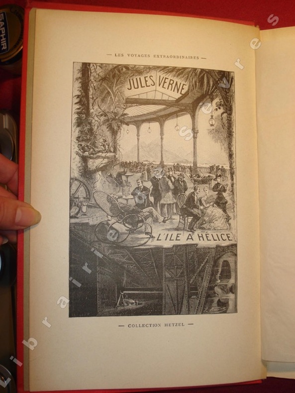 Edition originale illustrée de 80 dessins par Benett et 12 hors-texte en couleurs. Catalogue D pour 1895 attestant de la première édition. Cartonnage d'éditeur dit "Au portrait collé". Plaque signée Lenègre sur l'ancre. Lenègre et cie en queue du dos. Second plat de type Lenègre e. Belle plaque supérieure, aux ors bien nets et brillants. On remarquera que la vignette au phare n'est plus bleu ciel mais bleu nuit. Très bel exemplaire, malgré de minimes défauts. Minuscules taches noires sur la bordure rouge basse, une sur la bordure externe. Petites zones sombres dans le portrait. Coins un peu repliés. Dos un peu éclairci, plutôt bien, avec les ors un peu ternis. Fente en queue sur le mors supérieur sur 2 cm. Coiffe supérieure molle, frottée et affaissée. Coiffe de queue repliée. Second plat avec de nombreuses salissures et de straces blanchâtres. Pâles rousseurs éparses, ensemble plutôt frais, mais rousseurs sur la page de titre. Roman de science fiction dans lequel une île contenant toute une ville, est propulsée par des hélices. Les protagonistes sont un quatuor de musiciens, permettant à Verne de transmettre son amour de la musique. On y lit plusieurs remarques acerbes sur Wagner. - Photographies et détails sur www.Edition-Originale.com -