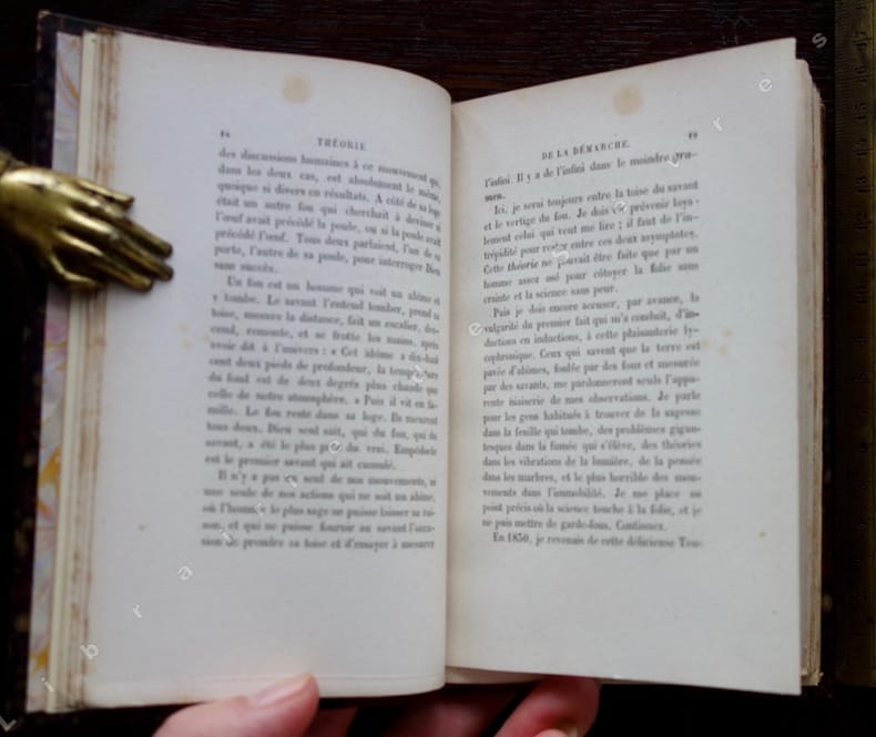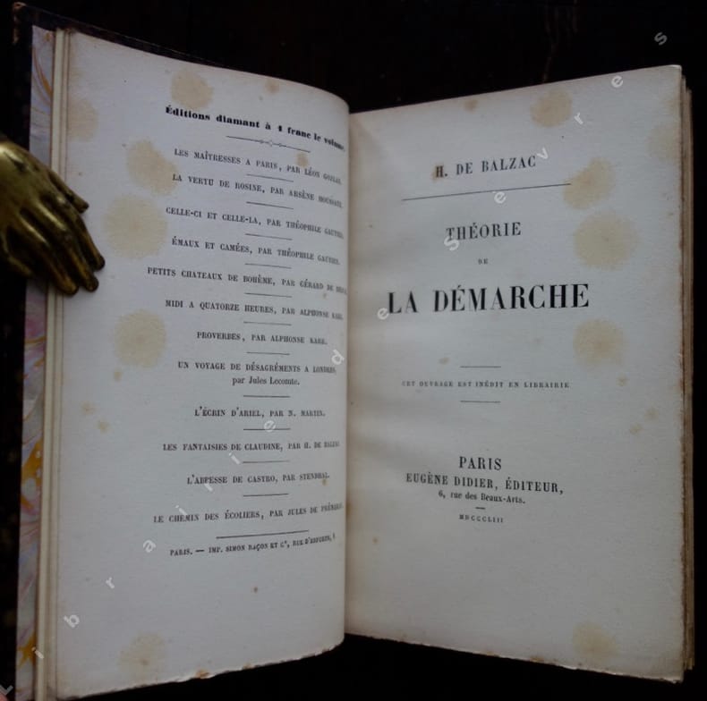 4 ouvrages reliés en 1 volume in-12, plein vélin recyclé postérieur (il s'agit certainement d'un remboîtage), titre doré, date en noir en pied. 1er ouvrage: Paris, Librairie nouvelle, 1853. 95 pp. 2ème ouvrage: Paris, Librairie nouvelle, 1854. 128 pp. 3ème ouvrage: Paris, Didier, 1853. 95 pp. 4ème ouvrage: Paris, Didier, 1853. 96 pp. Edition originale pour "Traité de la vie élégante", "Théorie de la démarche" et "Petits châteaux de Bohème. Prose et Poésie". Nombreuses rousseurs sur l'ensemble du volume.