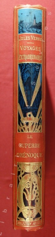 Première édition illustrée. 48 in-texte, 2 grandes gravures en noir et seulement 16 hors-texte polychromes sur les 20 que doit contenir l'ouvrage. Manque la 7e p. 168 ; la 8e p. 174 ; la 18e p. 384 ; la 19e p. 392 (en outre 3 de ces gravures sont annoncées en couleurs ou en tirage sépia et sont en noir dans cet exemplaire. Catalogue AJ in fine. IL n'y a qu'un seul cartonnage au globe doré pour ce titre. Cartonnage d'éditeur "Au globe doré" du 3e type. Plaque supérieure en bon état comportant une zone grattée au dessus des armes et sous le cartouche, des salissures à droite du premier cartouche Jules Verne ; en outre le globe doré vire visiblement au rouge davantage qu'au doré. Coins un peu frottés. Dos assez bien mais légèrement passé, avec coiffes frottées et repliées ; zone grattée dans la viggnette au phare. Second plat portant 3 légères traces de mouillures et de minces salissures. Première gravure couleur détachée. Rousseurs éparses. 2 feuillets légèrement ressortis. Excemplaire un peu gauchi. Rédigé en 1894 et paru pour la première fois en 1898, Le superbe Orénoque est un roman d'aventure mettant en scène une fille à la recherche de son père.Le roman est basé sur les récits de l'explorateur Jean Chaffanjeonqui effectua plusieurs voyages sur l'Orénoque et dans cette région du monde de 1884 à 1886. - Photographies et détails sur www.Edition-Originale.com -