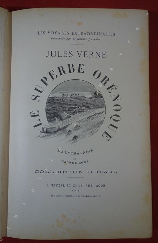 Première édition illustrée par Georges Roux, bien complète des 20 hors-texte, la plupart polychromes mais certains en noir et blanc ou sépia.Catalogue AJ in fine Il n'y a qu'un seul cartonnage au globe doré pour ce titre. Cartonnage d'éditeur "Au globe doré" du 3e type. Plaque signée Blancheland, relié par Engel. Second plat de typê Engel e, lettres verticales rouges sur fond noir. Rédigé en 1894 et paru pour la première fois en 1898, Le superbe Orénoque est un roman d'aventure mettant en scène une fille à la recherche de son père.Le roman est basé sur les récits de l'explorateur Jean Chaffanjeonqui effectua plusieurs voyages sur l'Orénoque et dans cette région du monde de 1884 à 1886. - Photographies et détails sur www.Edition-Originale.com -