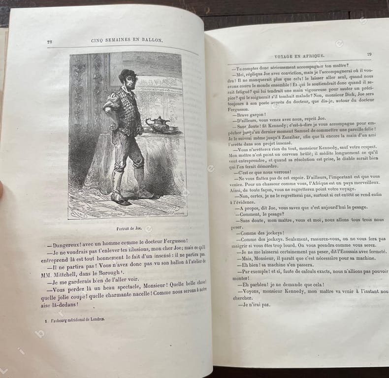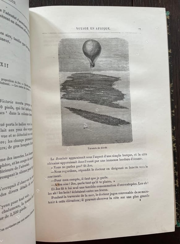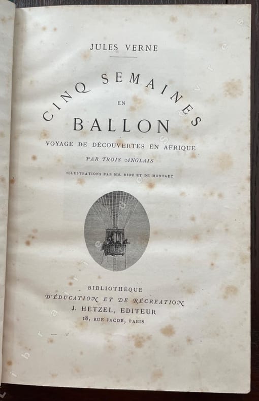 Paris, J. Hetzel / Bibliothèque d'Education et de Récréation/ Imp. Gauthier-Villars, sd (ca 1890), 180x280mm, demi-basane rouge, dos à 4 nerfs, titre à l'or, plats papier marbré, 267p., 211p., 202p. Reliures présentant des frottements sur les plats. Rousseurs éparses. Bon et solide exemplaire. "Cinq semaines en ballon" est le premier roman de J. Verne édité par Hetzel en 1863. Ce titre ne sera illustré qu'à partir de 1892 par Riou et Montaut. P